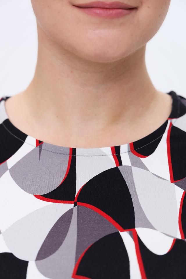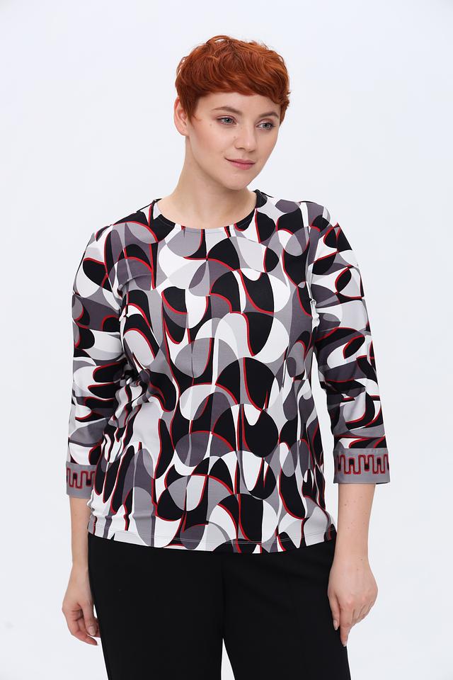 Лонгслив имеет оригинальный геометрический принт, сочетающий в себе чёрный, белый и красный цвета. Такой рисунок придаёт изделию современный и динамичный вид. Вырез горловины – округлый, классический. Рукава – три четверти.