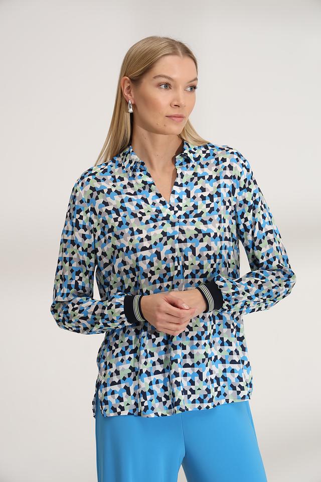 Эта блуза от Bianca – идеальный выбор для создания яркого и запоминающегося образа. Выполнена в голубой цветовой гамме с оригинальным геометрическим принтом, который состоит из треугольников и других фигур в различных оттенках синего, зелёного и белого.