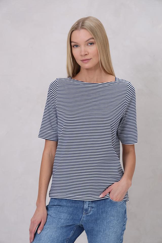Эта стильная футболка от Bianca станет незаменимой вещью в вашем гардеробе. Классический дизайн в бело-синюю полоску делает ее универсальной и подходящей для различных стилей.