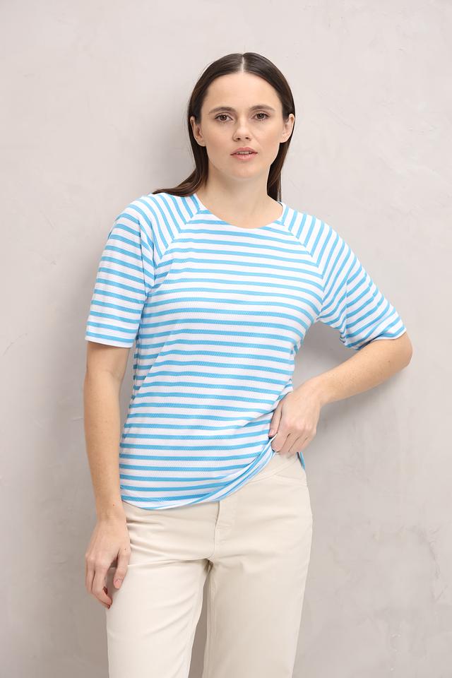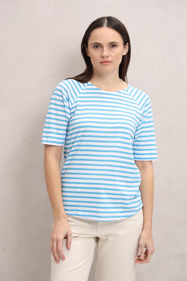 Женская футболка Bianca голубого цвета с классическим полосатым дизайном. Изготовлена из мягкого и приятного к телу сочетания хлопка, вискозы и полиэстера, обеспечивающего комфорт и долговечность. Состав: хлопок 60%, вискоза 20%, полиэстер 20%