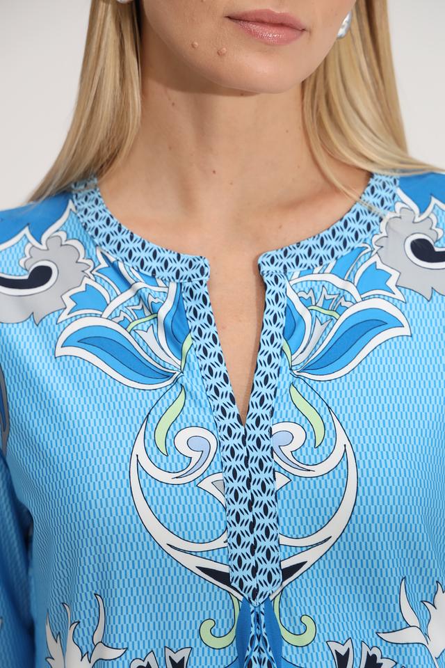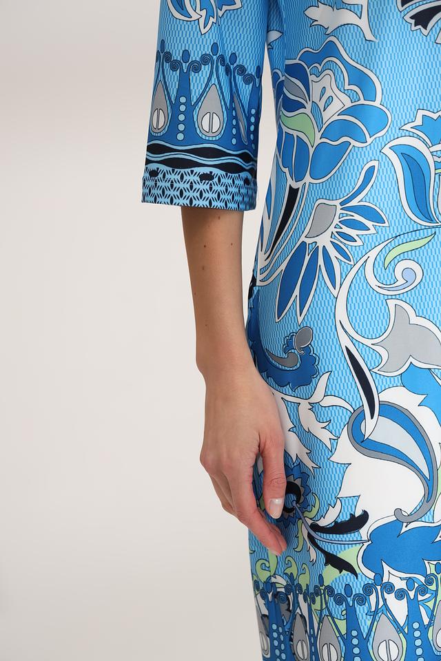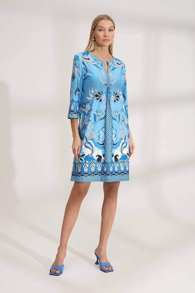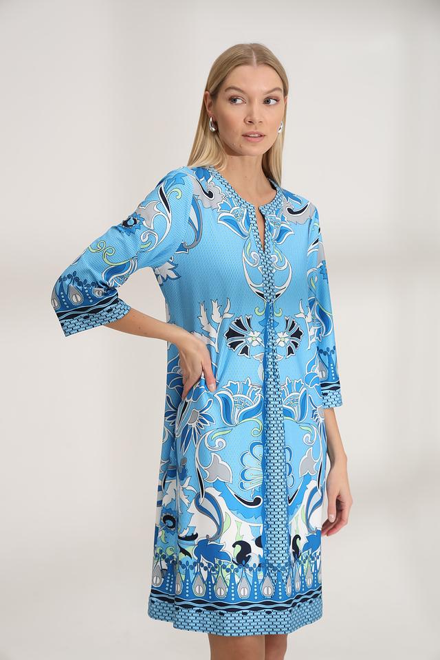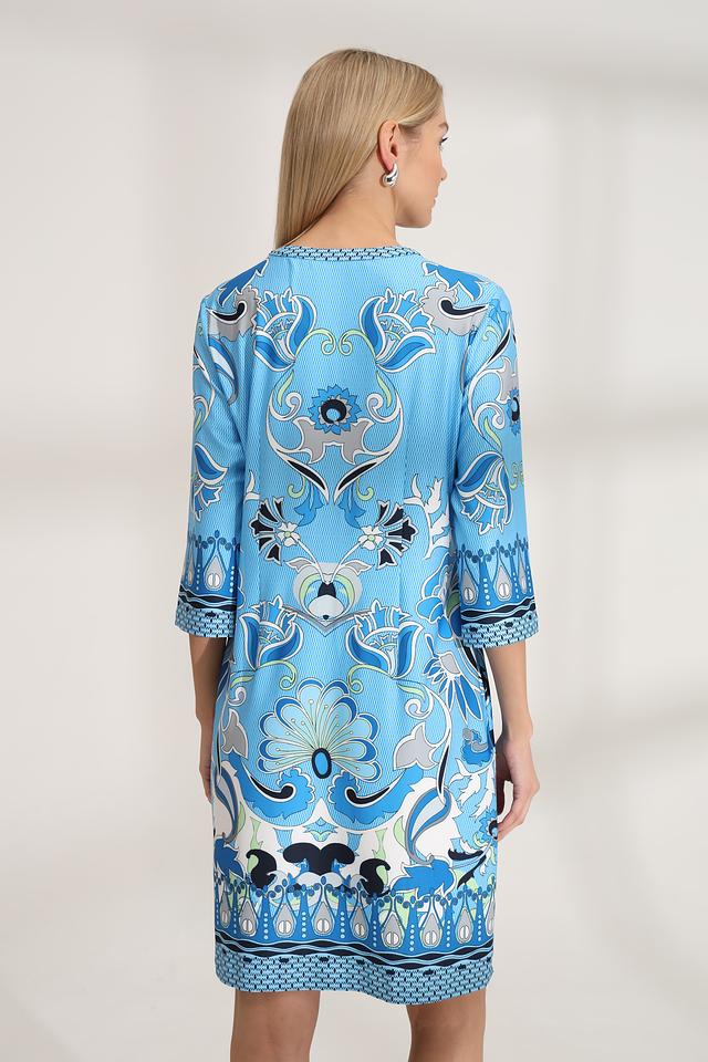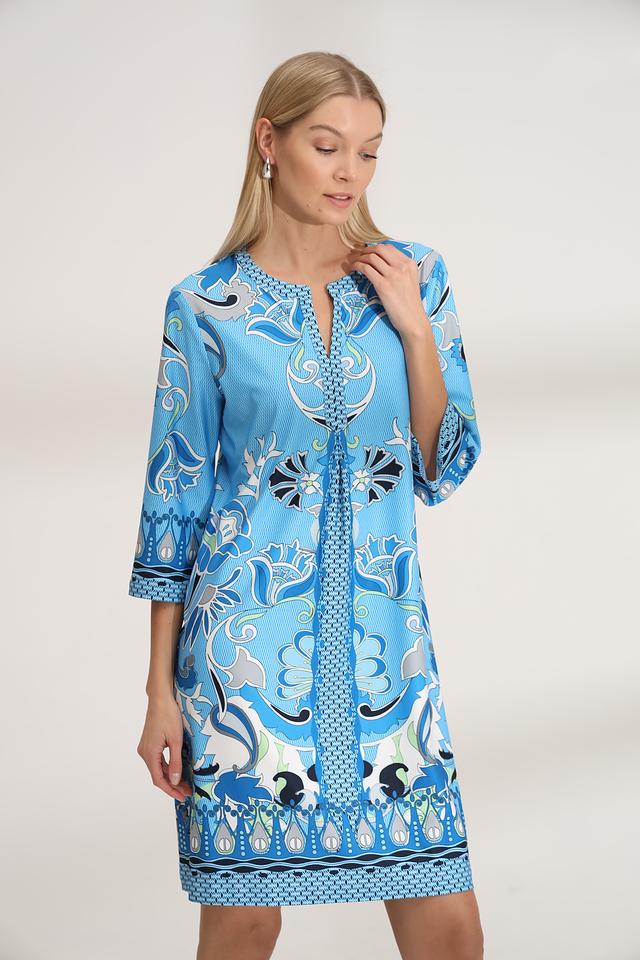Платье имеет прямой силуэт, длину мини и рукава три четверти. V-образный вырез горловины дополнен декоративной отделкой с принтом, повторяющим основной рисунок платья. Модель не имеет застежек, что обеспечивает легкость одевания и комфорт при носке.