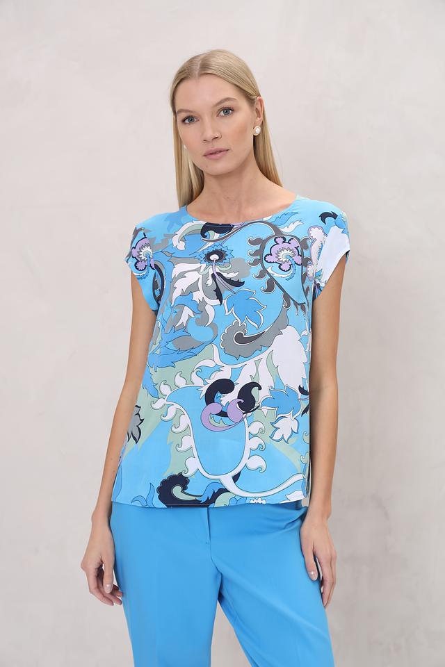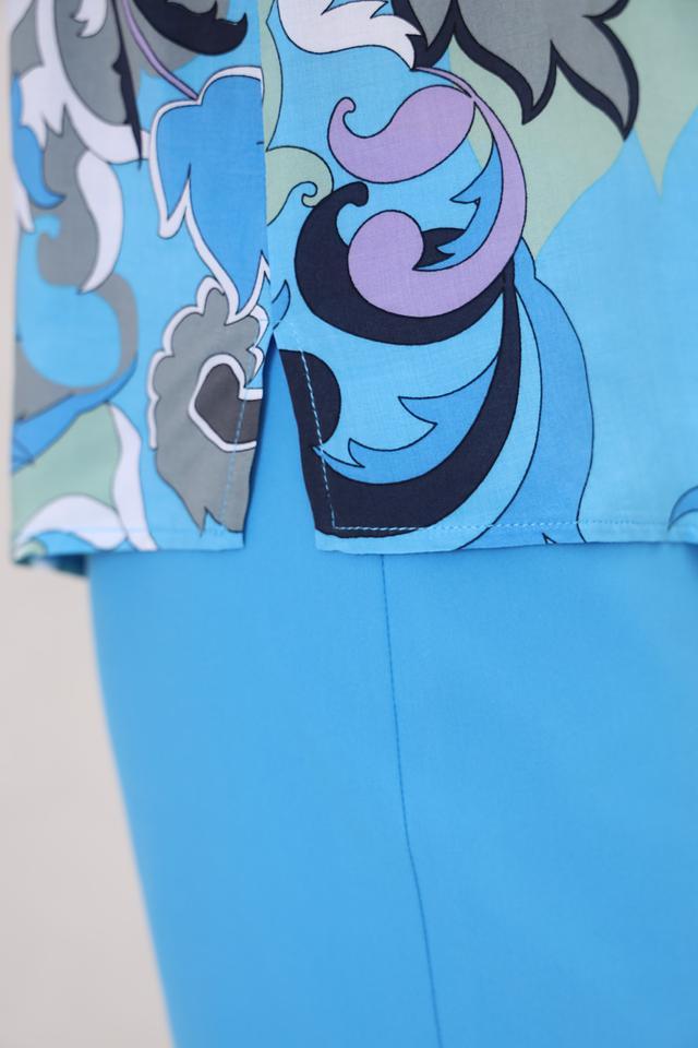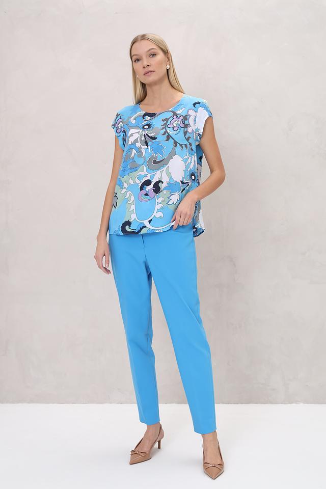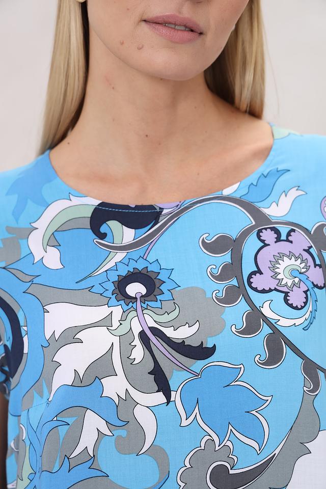 Основной цвет блузы – голубой, но она украшена ярким и красочным цветочным принтом, который придает ей неповторимый вид. Принт включает в себя различные оттенки серого, белого, синего и фиолетового цветов, создавая гармоничное сочетание.