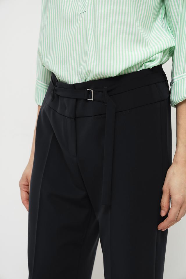 Темно-синие брюки от Bianca — элегантная база для создания деловых и повседневных образов. Классический крой и пояс с завязками обеспечивают комфортную посадку и свободу движений. Состав: полиэстер 91%, эластан 9%