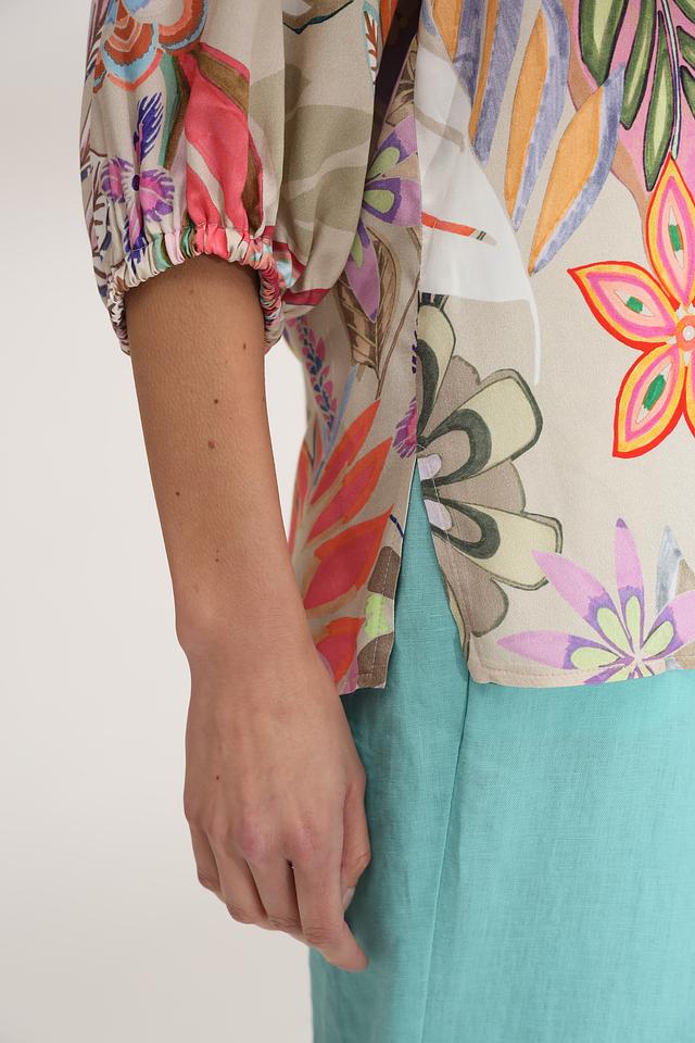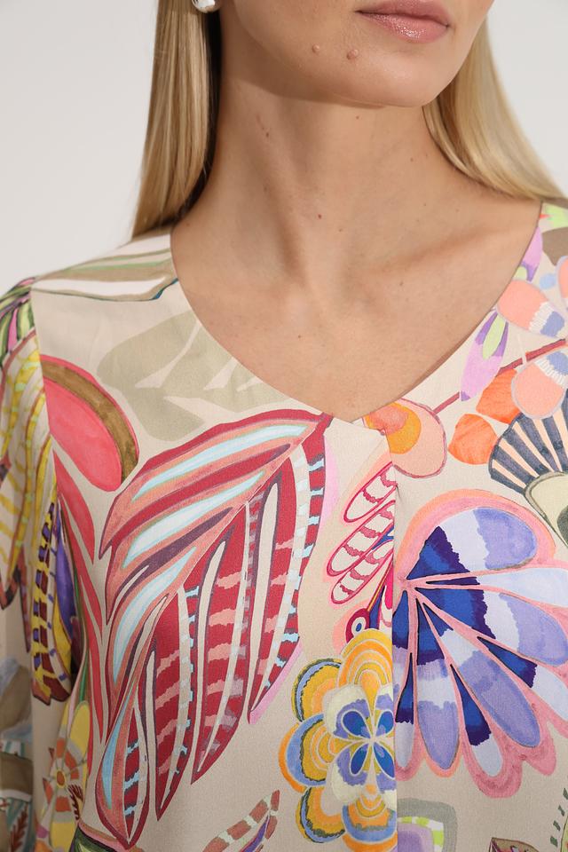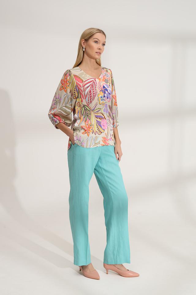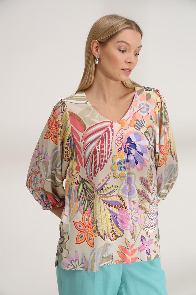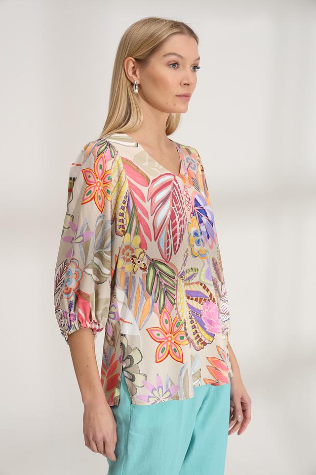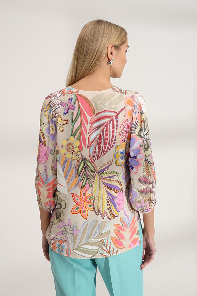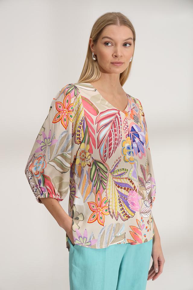Блуза имеет свободный крой, V-образный вырез горловины и рукава длиной 3/4 с небольшими сборками у манжет. Главная особенность этой модели – эффектный цветочный принт, который сочетает в себе множество ярких оттенков.