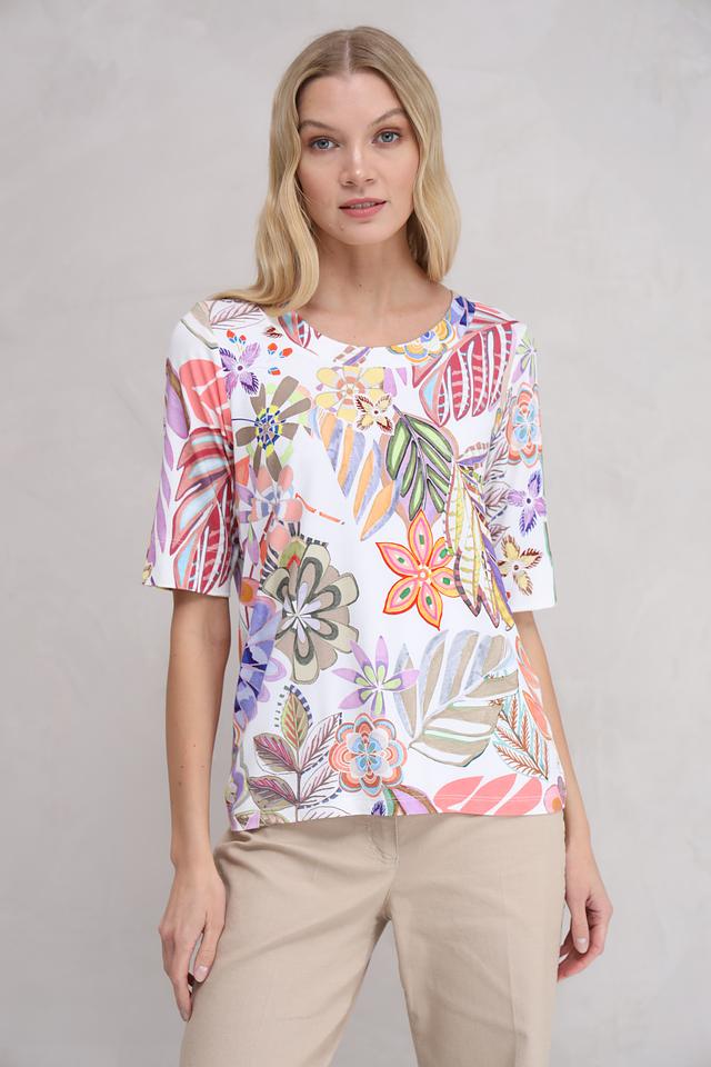 Женская футболка Bianca белого цвета с ярким цветочным принтом станет отличным дополнением к вашему гардеробу. Модель выполнена из мягкой вискозы с добавлением эластана, что обеспечивает комфорт и удобство в носке. Состав: вискоза 94%, эластан 6%