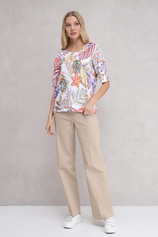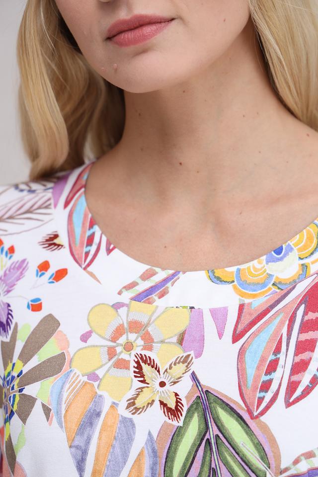 Футболка имеет прямой крой и короткий рукав, что делает ее универсальной для различных типов фигур. Основной цвет – белый, а главным украшением является красочный цветочный принт, который добавляет легкости и женственности.