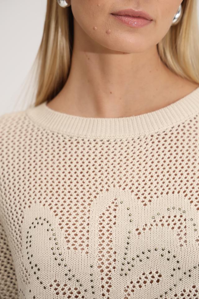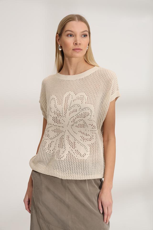 Бежевый пуловер от Bianca с ажурной кружевной вставкой на груди. Модель выполнена из мягкого трикотажа с короткими рукавами, идеально подходит для создания лёгкого и стильного образа. Состав: полиакрил 55%, хлопок 45%