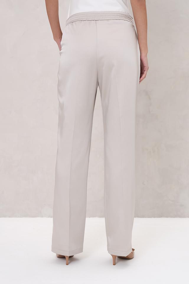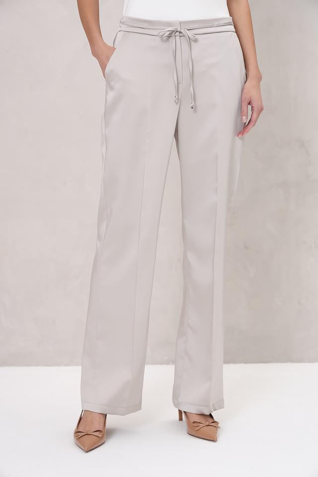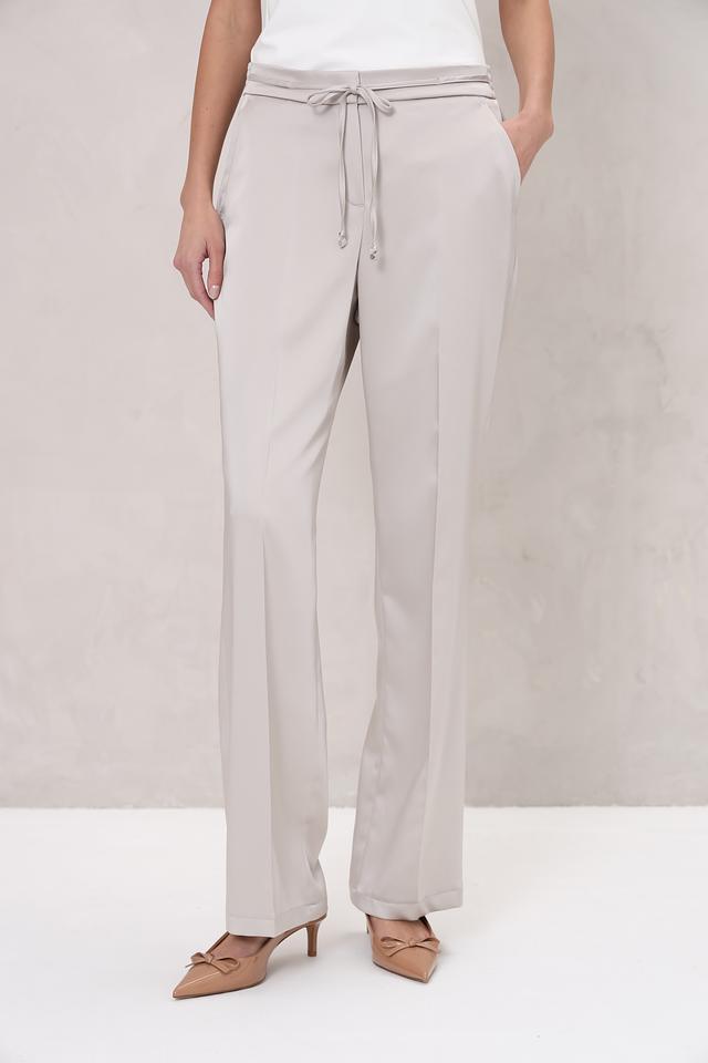 Брюки имеют классический крой с прямыми штанинами и завышенной талией. Завязки на талии позволяют регулировать посадку и подчеркивать фигуру. Модель выполнена в нежном бежевом цвете, который легко сочетается с различными элементами одежды.