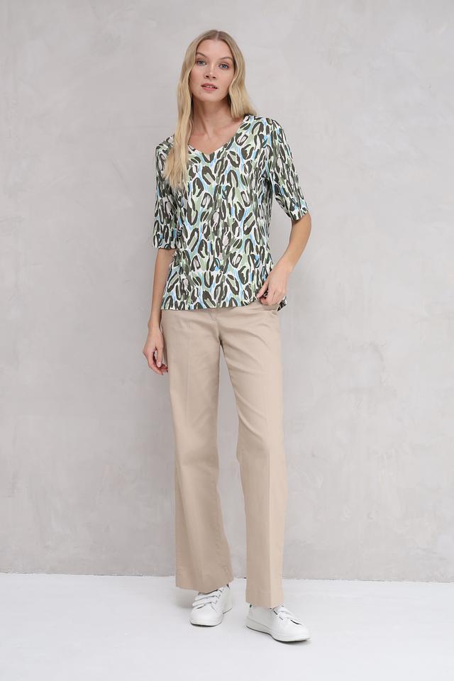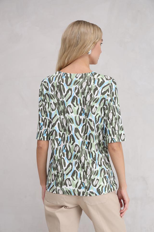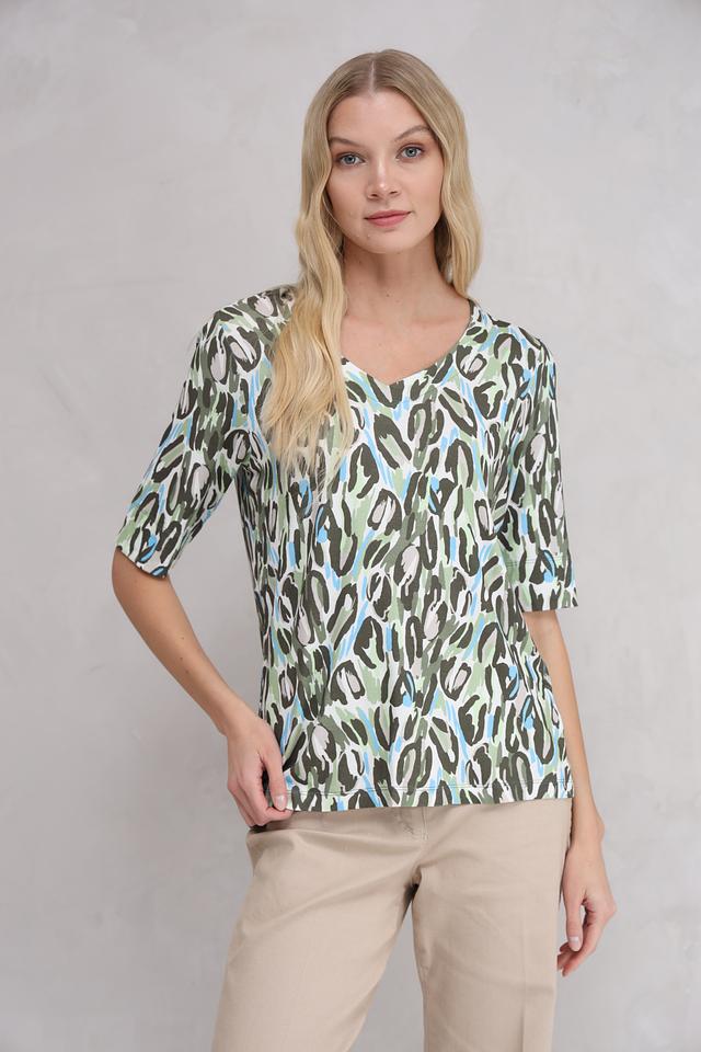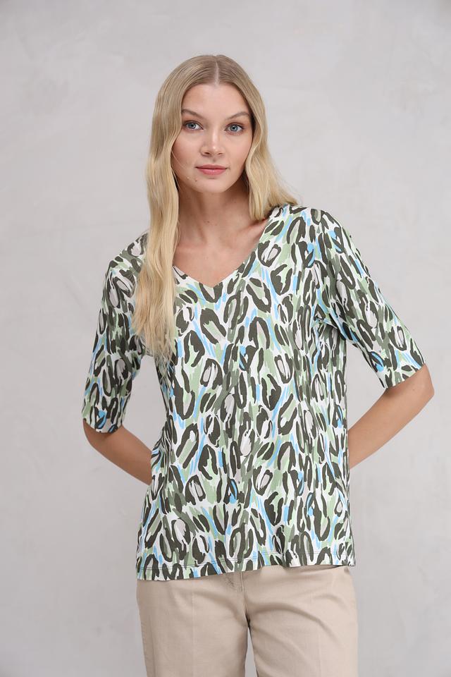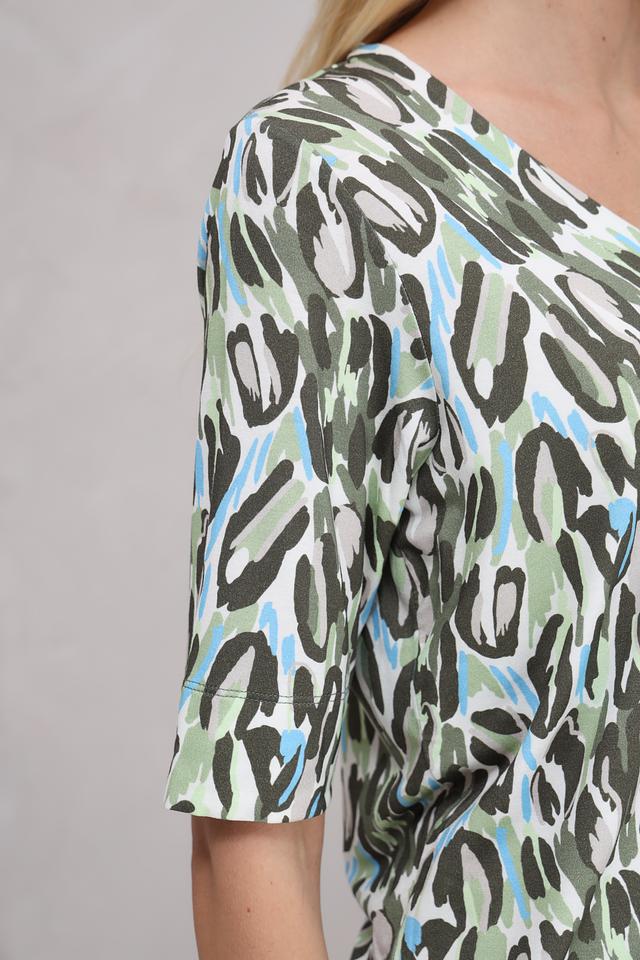 Футболка имеет прямой крой и короткий рукав, что делает ее универсальной для различных образов. Особенностью модели является яркий принт в виде леопардовых пятен, выполненный в сочетании зеленых и голубых оттенков. V-образный вырез горловины подчеркивает женственность силуэта.