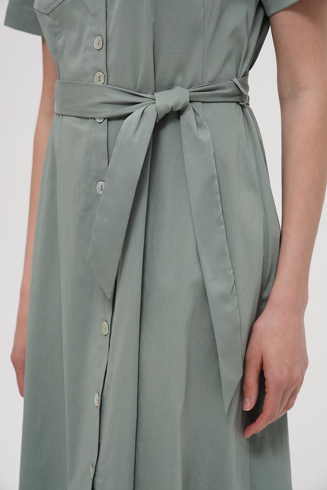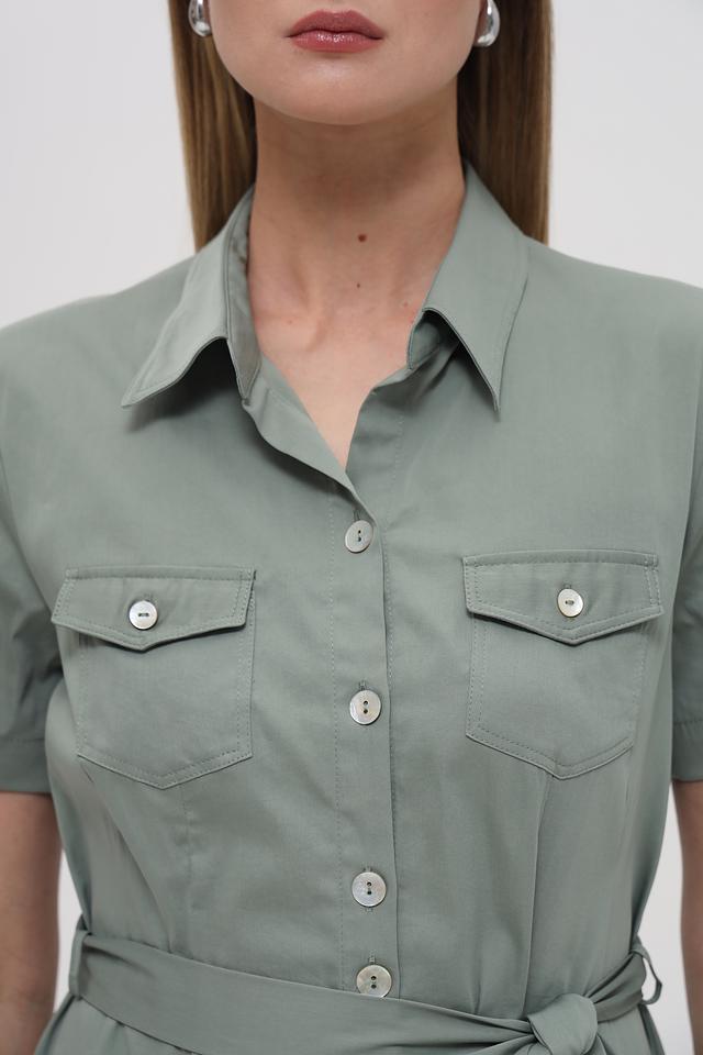 Платье застегивается на пуговицы по всей длине. На груди расположены два накладных кармана с клапанами. Короткие рукава делают платье идеальным для теплой погоды.