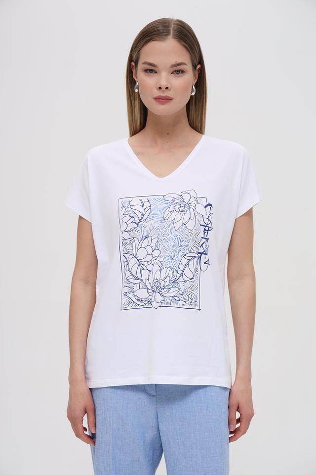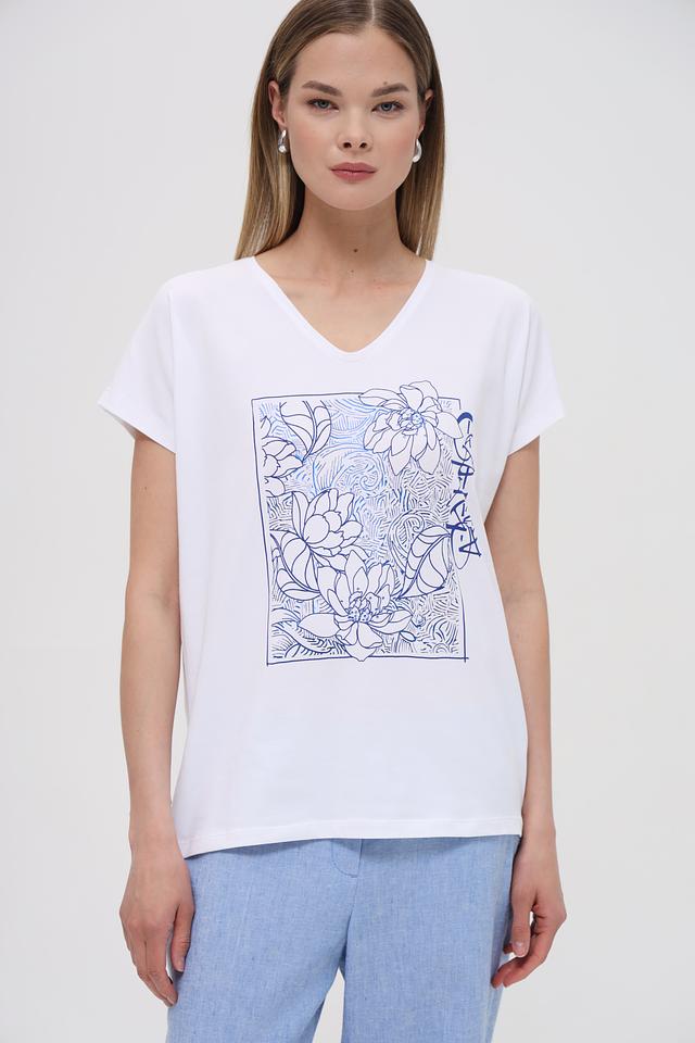 Белая футболка Bianca с оригинальным цветочным принтом станет отличным дополнением к вашему гардеробу. Модель выполнена из мягкого хлопка с добавлением эластана для комфорта и хорошей посадки. Состав: хлопок 92%, эластан 8%