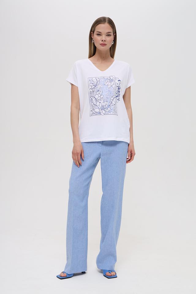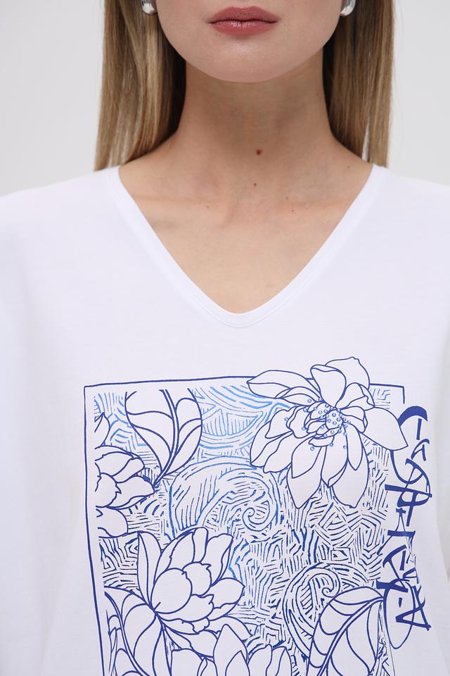 Особенностью данной модели является яркий цветочный принт в голубых тонах, который добавляет ей изюминку и оригинальность. Футболка имеет V-образный вырез горловины, что подчеркивает женственность силуэта. Короткие рукава делают ее идеальным выбором для теплой погоды.