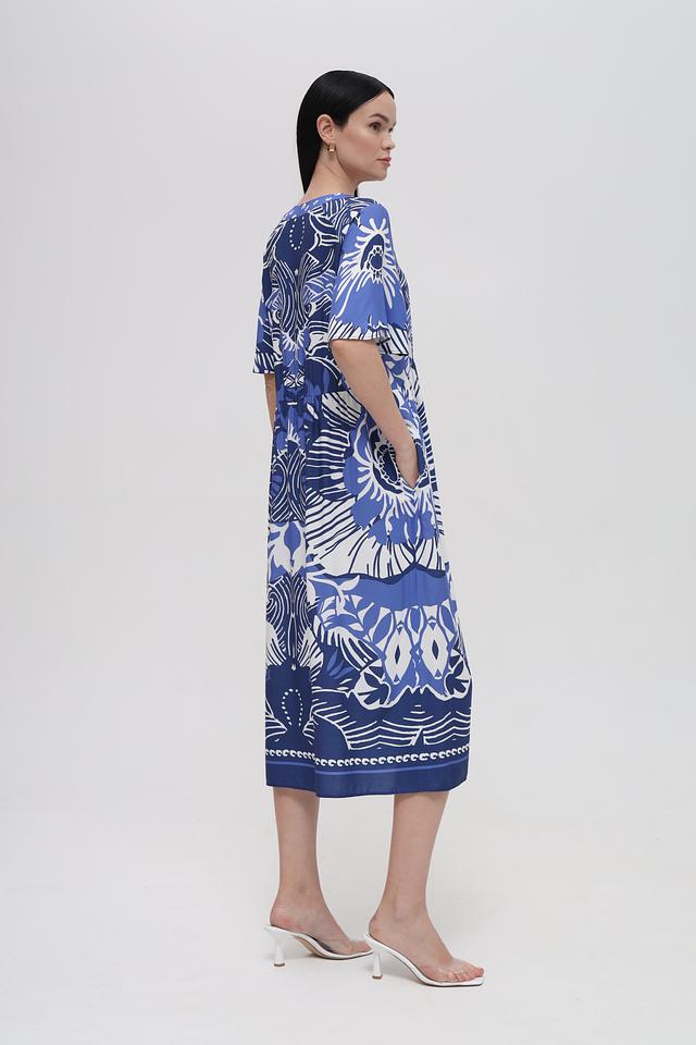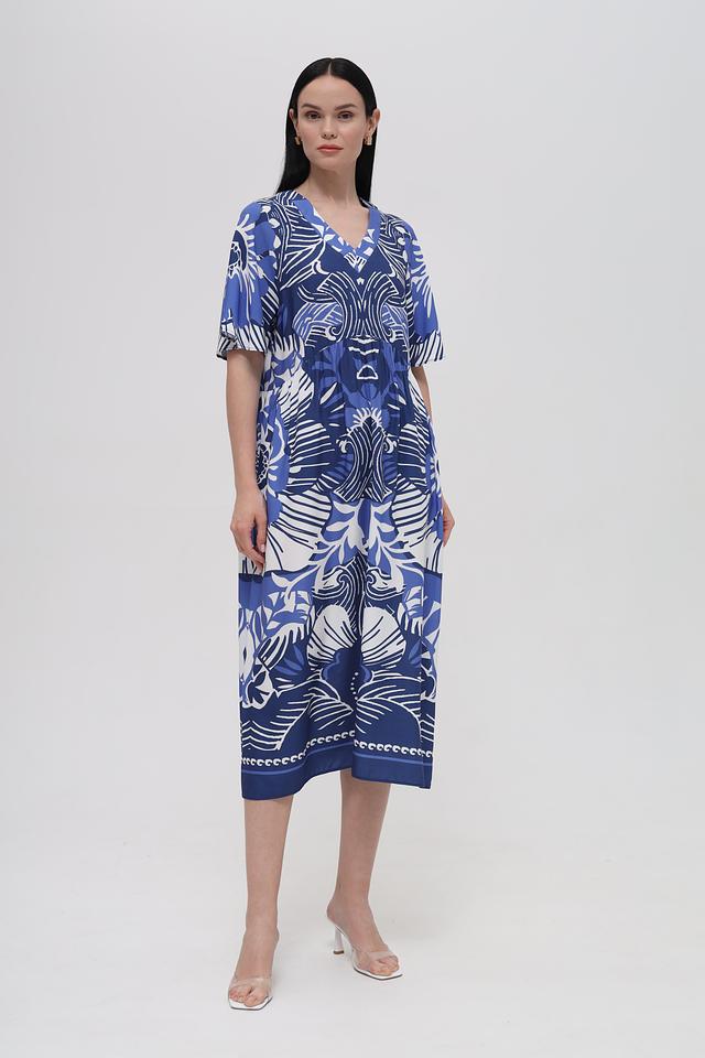 Платье имеет прямой силуэт и длину миди, что делает его универсальным для различных случаев. V-образный вырез горловины и короткие рукава с воланами придают образу женственность и лёгкость. Основной цвет платья – синий, но оно украшено ярким и красочным цветочным принтом, который делает его неповторимым.