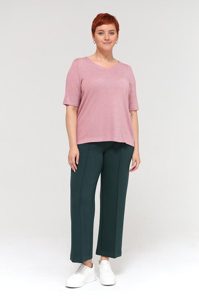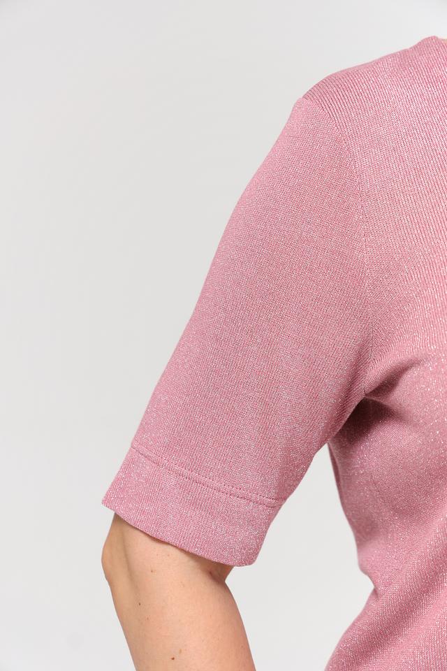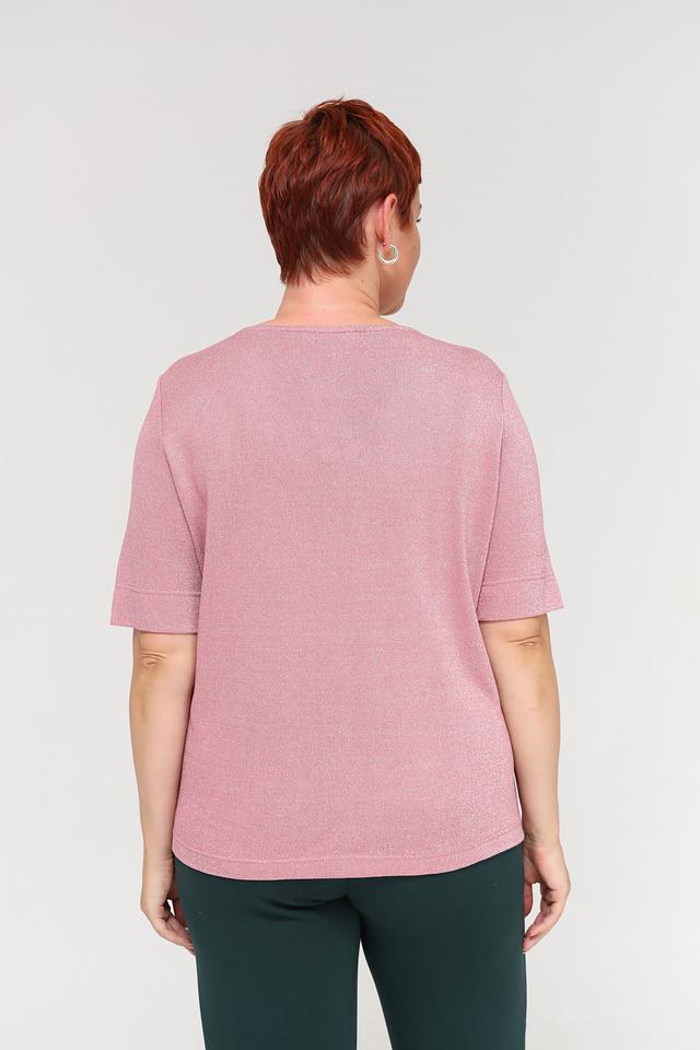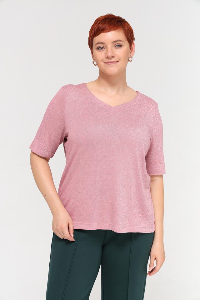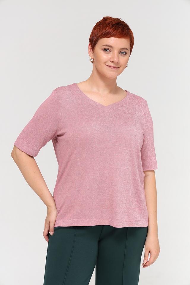 Розовая футболка Bianca из вискозы с добавлением металлизированной нити. Модель имеет V-образный вырез и короткий рукав, обеспечивая комфорт и лёгкость в носке. Идеально подойдёт для создания стильного повседневного образа. Состав: вискоза 82%, метализ.нить 18%
