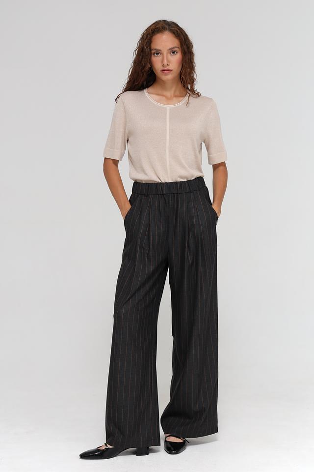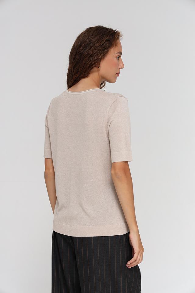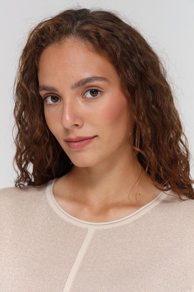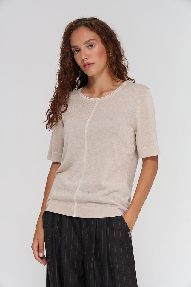 Пуловер имеет короткий рукав и круглый вырез горловины. Вертикальная вставка спереди визуально вытягивает силуэт и добавляет изюминку в дизайн. Благодаря своему нейтральному цвету, этот пуловер легко сочетается с различными элементами одежды.