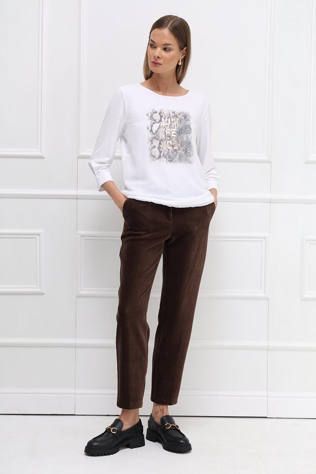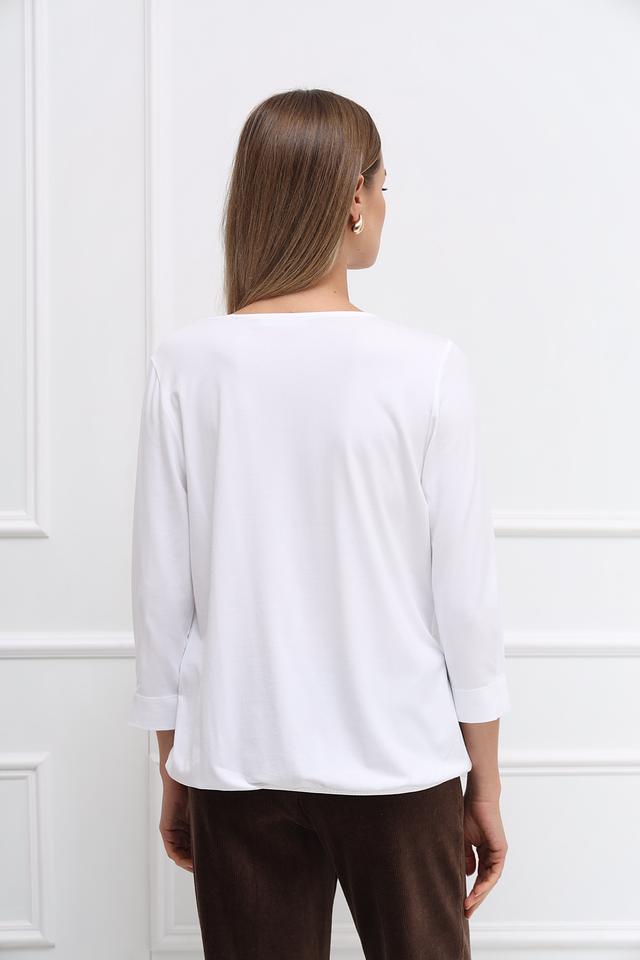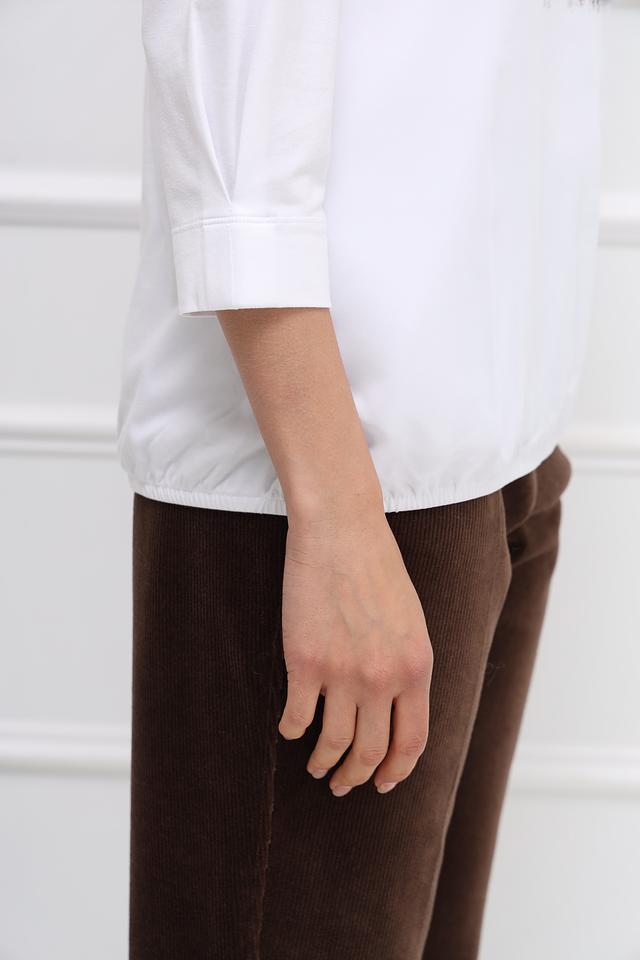 Блуза имеет прямой крой, круглый вырез горловины и рукава длиной три четверти. Состав ткани включает 48% хлопка, 48% модала и 4% эластана, что обеспечивает комфорт, мягкость и хорошую посадку по фигуре.