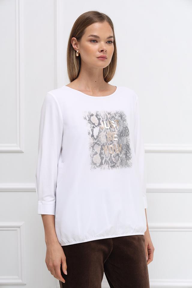 Особенностью данной модели является яркий принт с надписью "Just Be" и абстрактным рисунком, выполненным в серебристых и серых тонах. Принт расположен в центральной части блузы и придает ей индивидуальность.