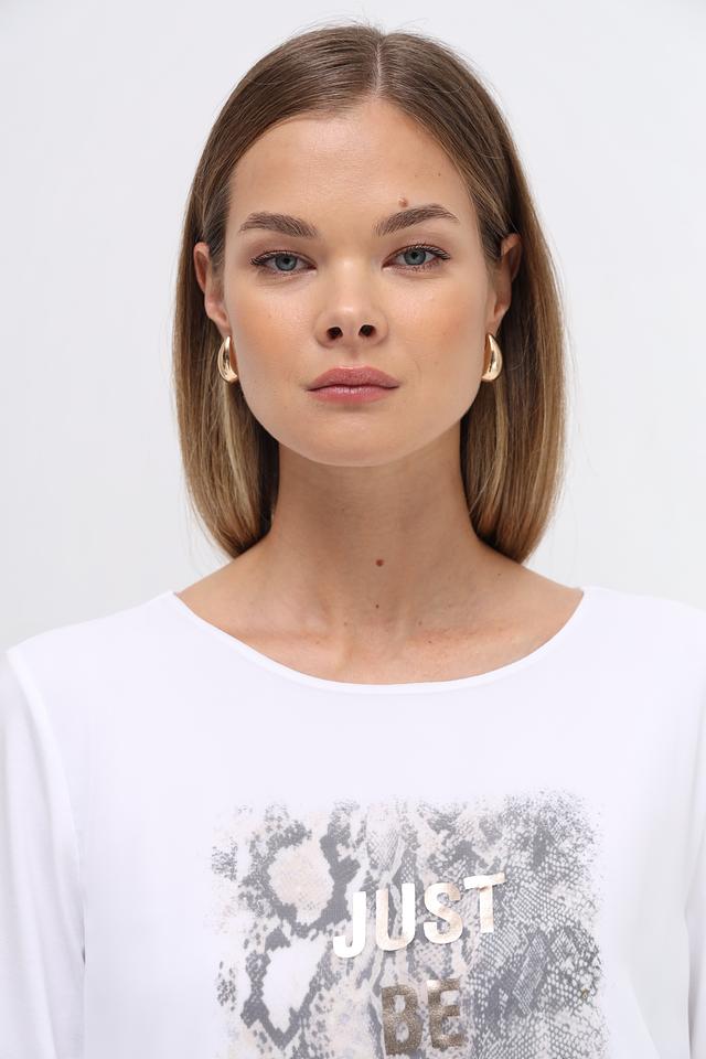 Белая блуза Bianca с оригинальным принтом "Just Be" станет стильным дополнением к вашему гардеробу. Модель выполнена из мягкой и приятной к телу ткани с добавлением модала и эластана, обеспечивающих комфорт при носке. Состав: хлопок 48%, модал 48%, эластан 4%
