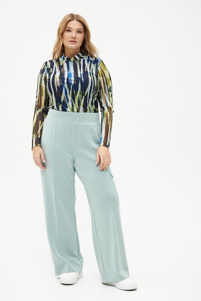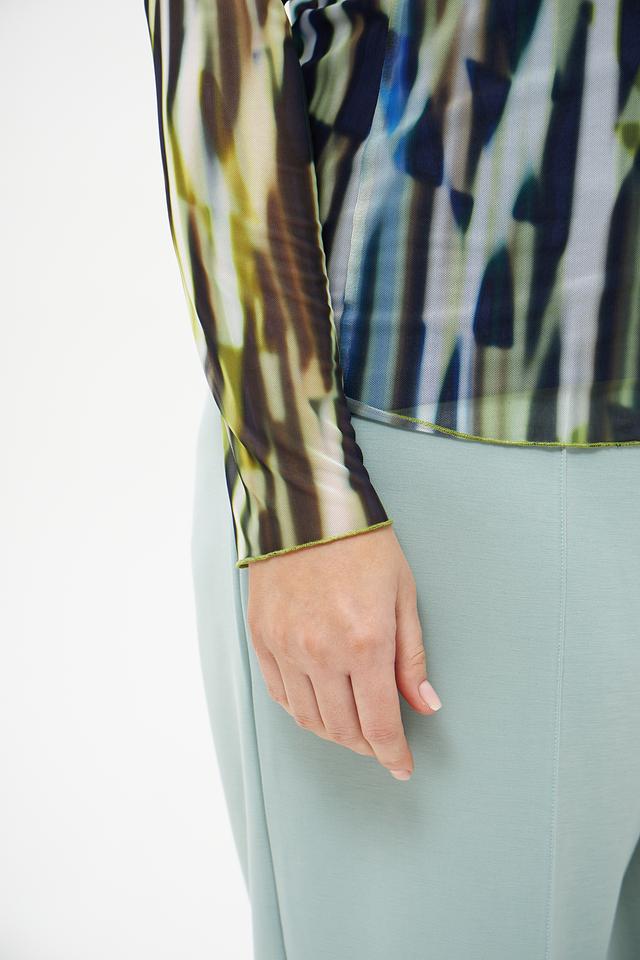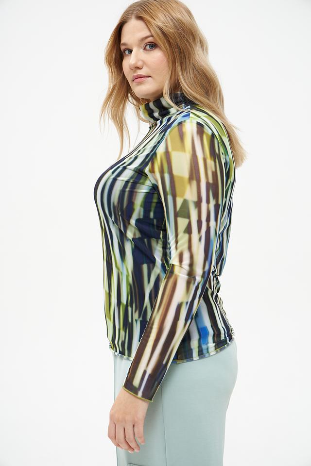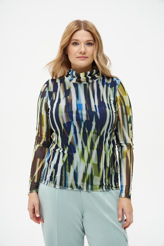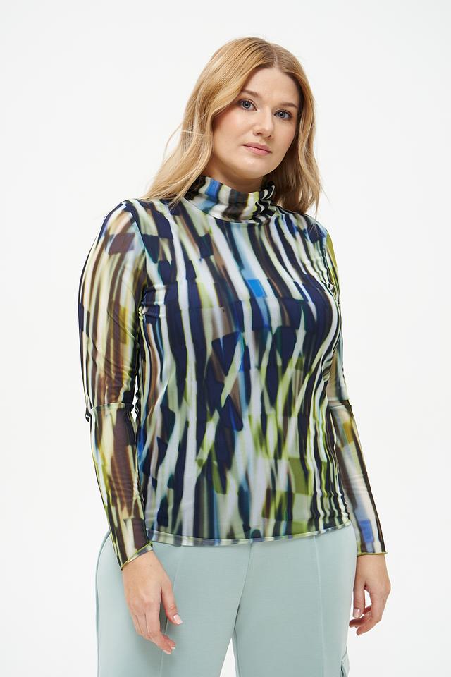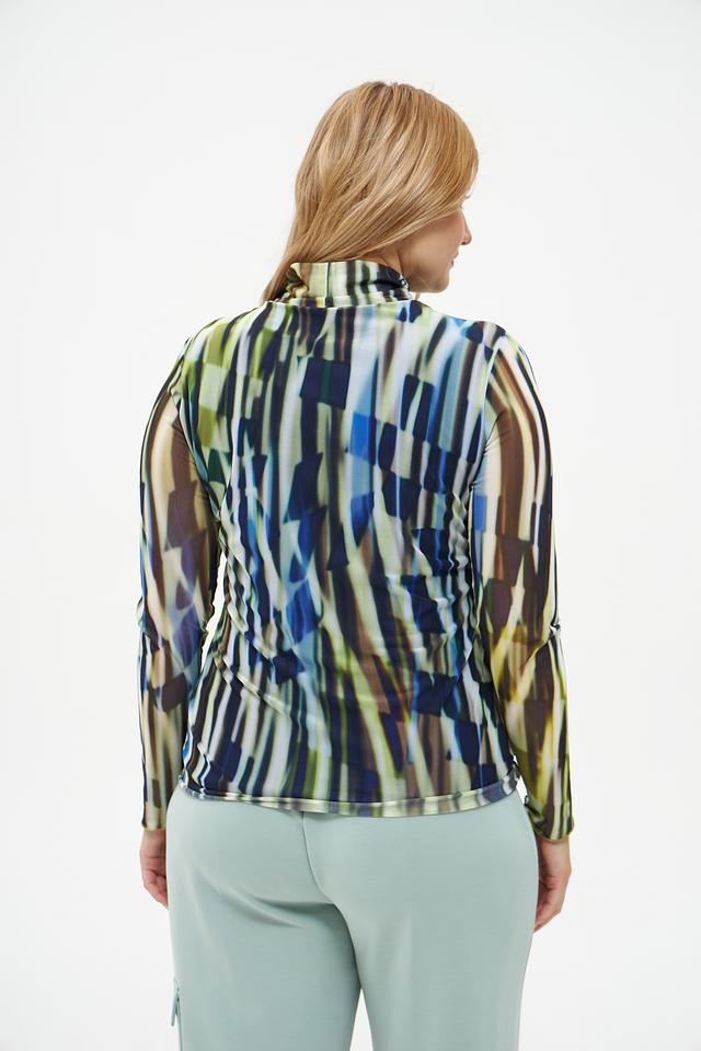 Особенностью данной модели является оригинальный абстрактный принт, выполненный в сочетании синих, зеленых и желтых оттенков. Блуза имеет длинные рукава и высокий воротник-стойку, что придает ей элегантный и современный вид.