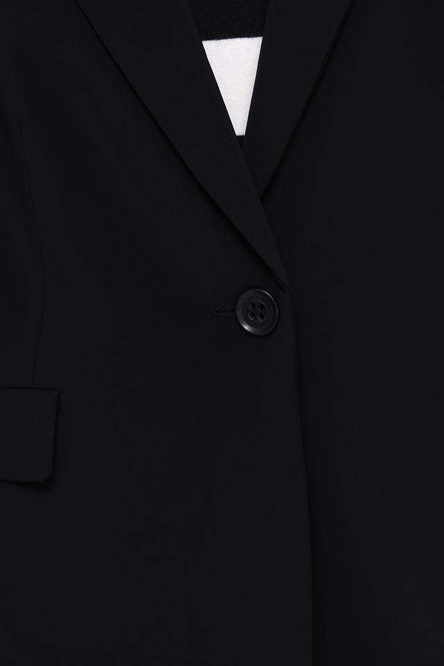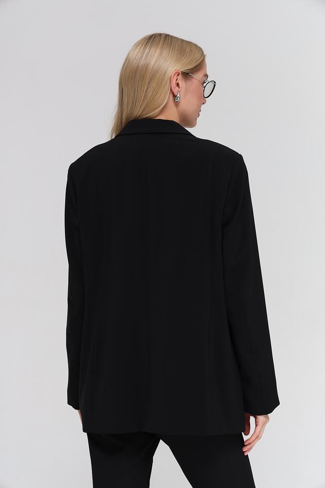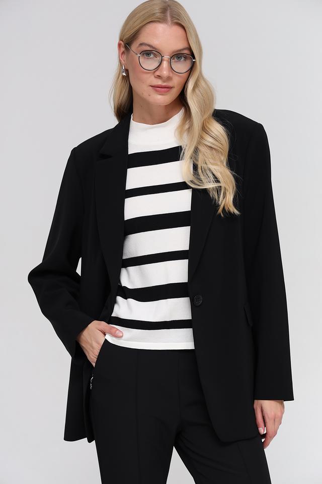 Чёрный жакет Bianca оверсайз кроя станет стильным дополнением к вашему гардеробу. Модель выполнена из полиэстера с добавлением эластана, что обеспечивает комфорт и свободу движений. Жакет имеет классический лацкан и застёжку на одну пуговицу. Состав: полиэстер 91%, эластан 9%