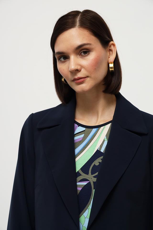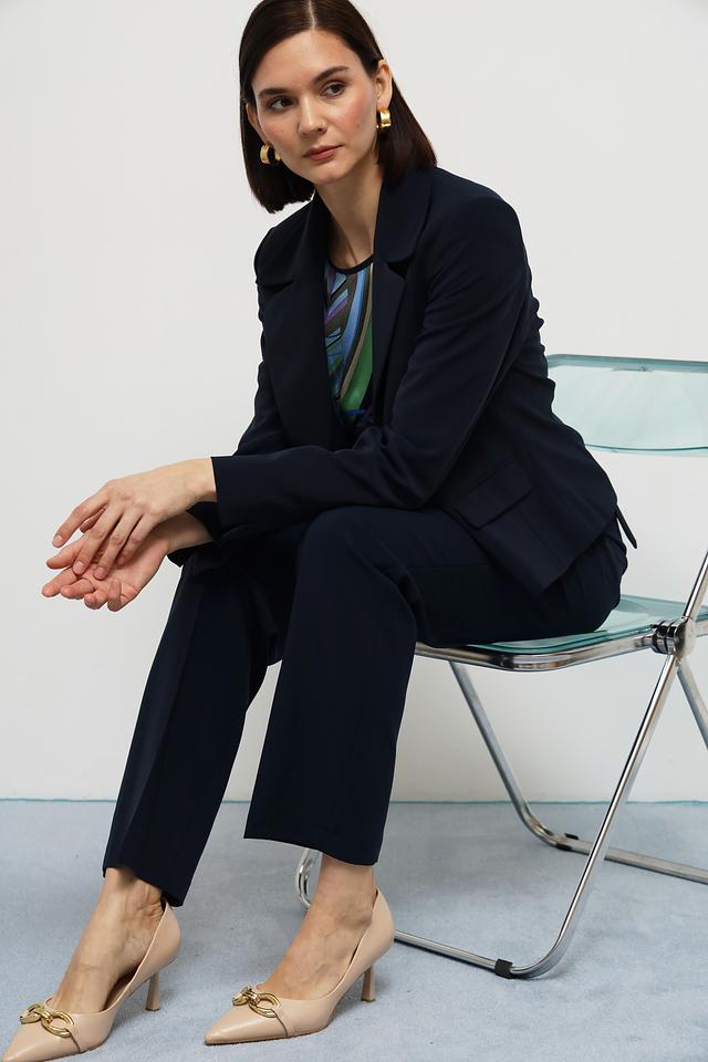 Этот стильный жакет от Bianca выполнен в классическом тёмно-синем цвете. Прямой крой и приталенный силуэт подчеркивают фигуру, создавая элегантный образ.