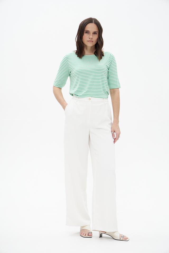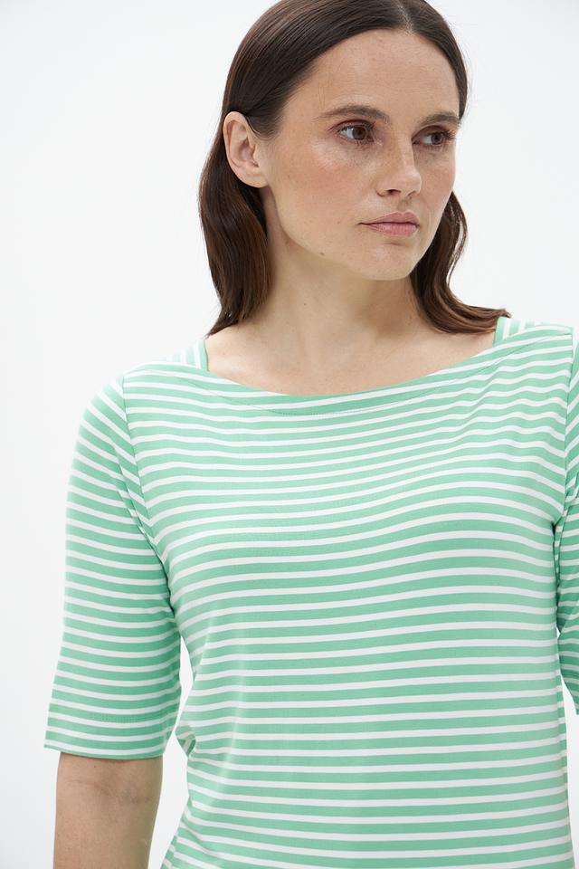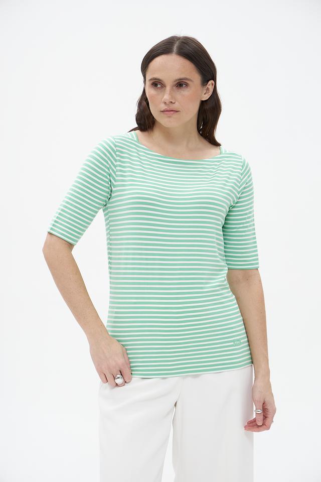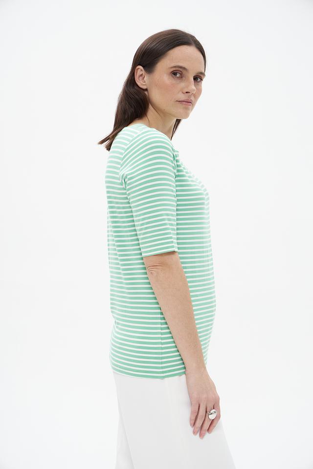 Основной цвет футболки – мятный, дополненный тонкими белыми полосками. Такое сочетание выглядит свежо и легко, идеально подходит для создания летних образов.