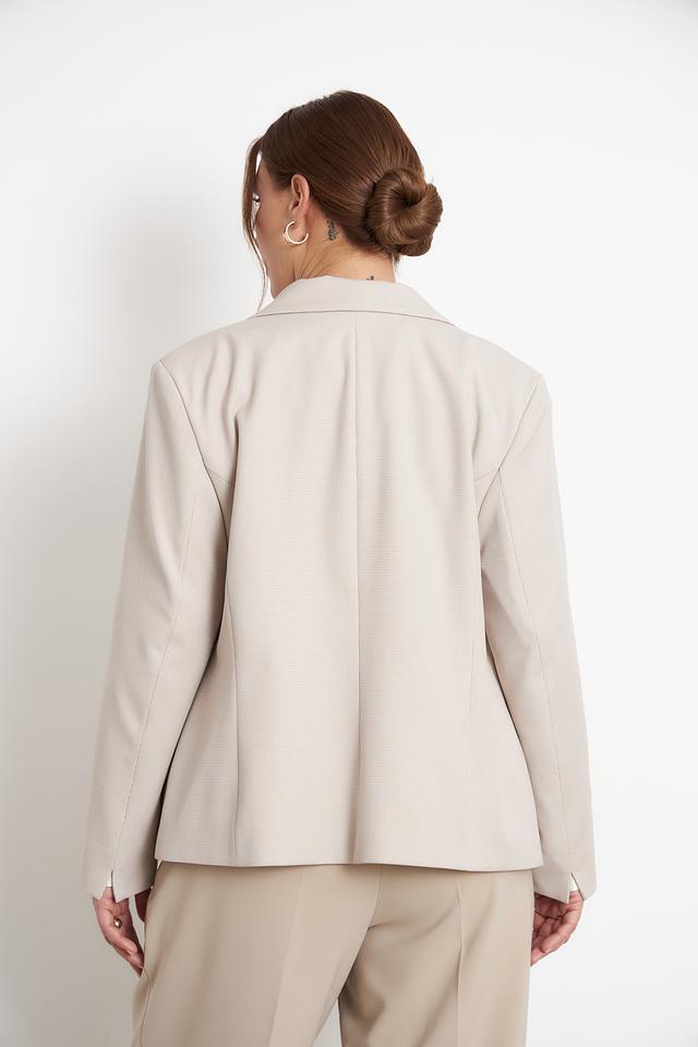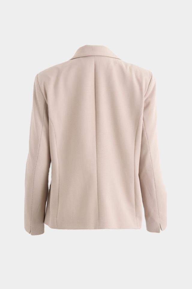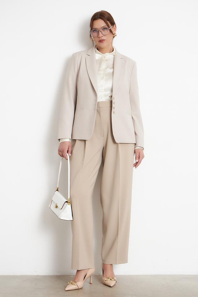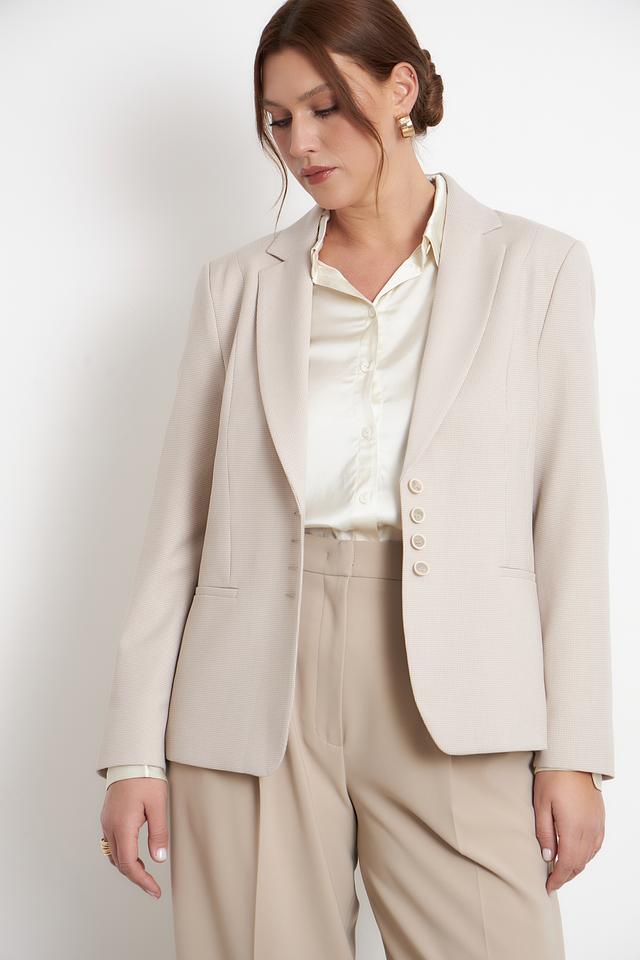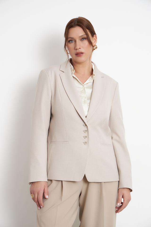 Жакет имеет длинные рукава и два функциональных кармана с клапанами. Бежевый цвет делает его универсальным и легко сочетаемым с различными элементами гардероба. Этот жакет станет отличным дополнением к вашему деловому или повседневному стилю.