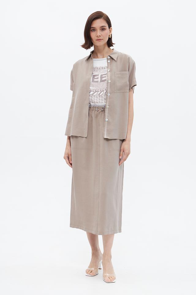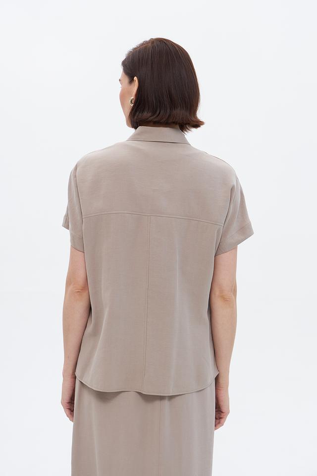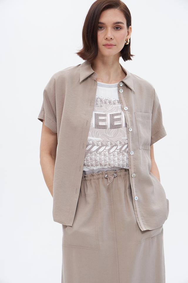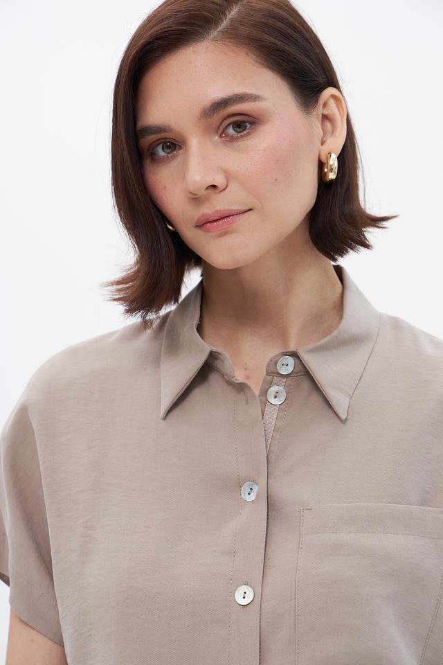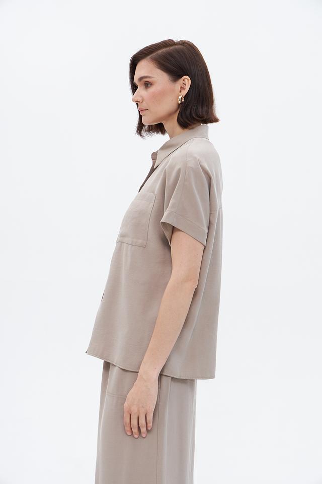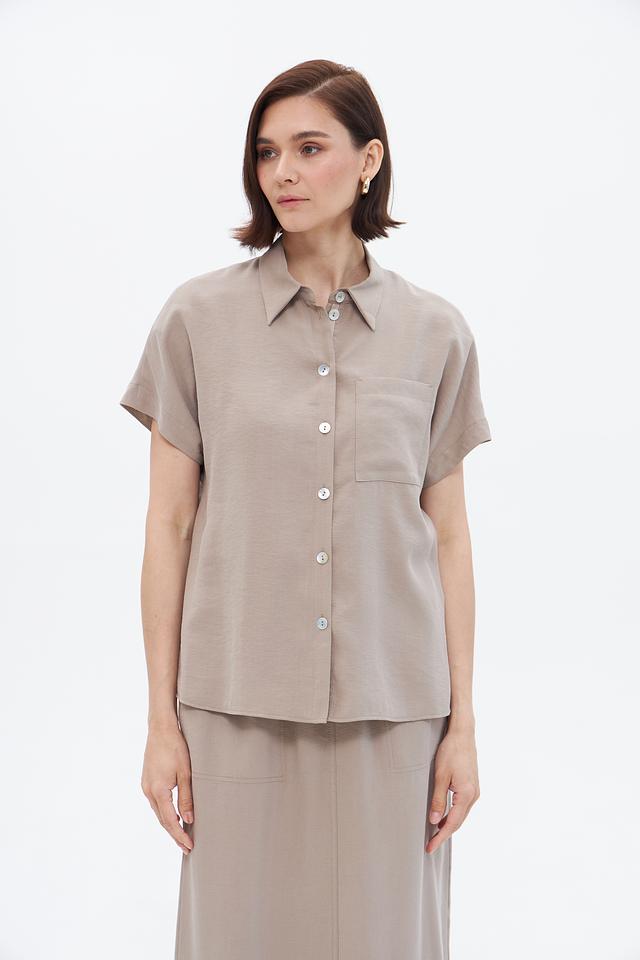 Бежевая блуза Bianca свободного кроя с короткими рукавами и накладными карманами. Выполнена из мягкой и приятной к телу ткани модал с добавлением полиэстера, что обеспечивает комфорт и практичность. Состав: модал 90%, полиэстер 10%