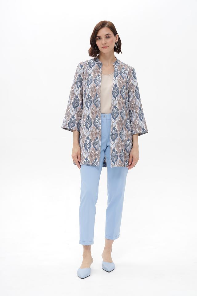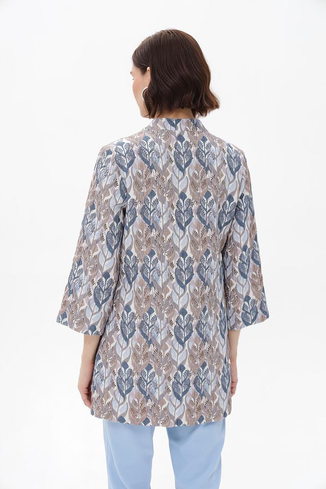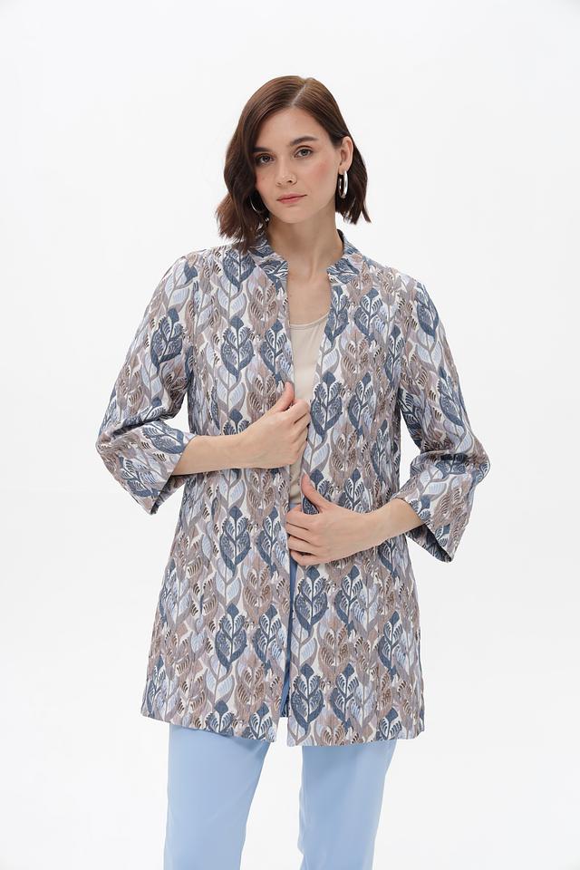 Модель имеет прямой крой, короткий рукав 3/4 и открытую конструкцию без застежек. Воротник-стойка придает жакету особый шарм. Жакет выполнен из качественного полиэстера с добавлением хлопка и эластана, что обеспечивает комфорт в носке и хорошую посадку по фигуре.