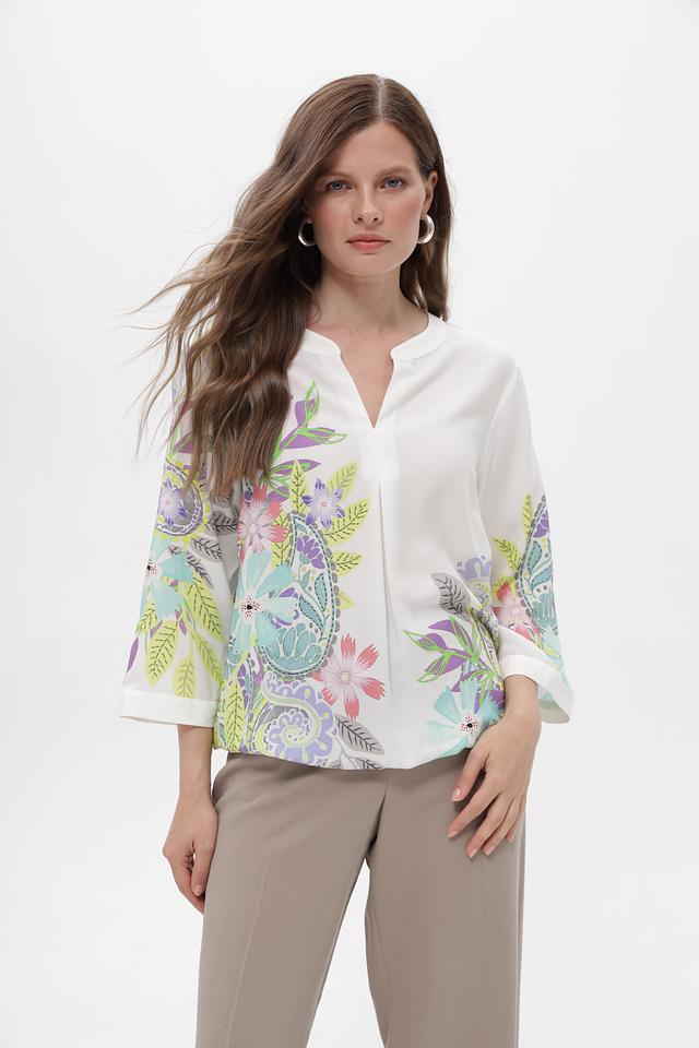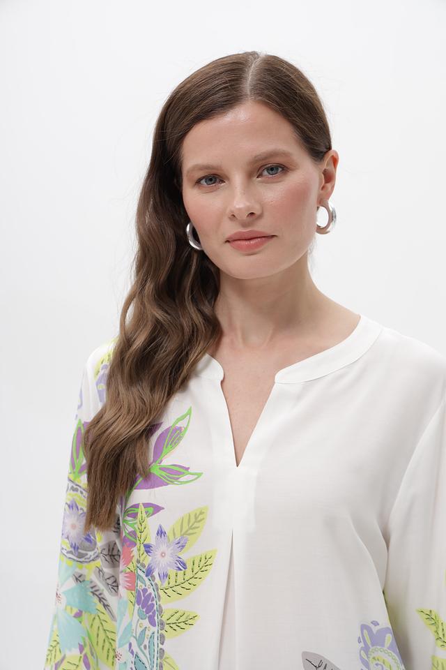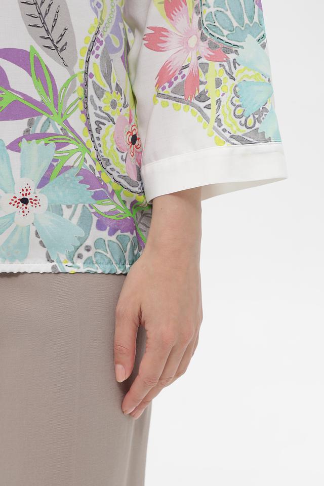 Белая блузка Bianca с ярким цветочным принтом, выполненная из 100% вискозы. Модель с V-образным вырезом и рукавами 3/4, идеально подходит для создания лёгкого и женственного образа. Состав: вискоза 100%