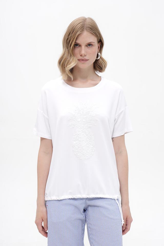 Футболка имеет свободный крой, который не сковывает движений, и короткий рукав, что делает ее идеальным выбором для теплой погоды. Передняя часть футболки украшена стильным принтом в виде ананаса, который придает ей оригинальность и индивидуальность.