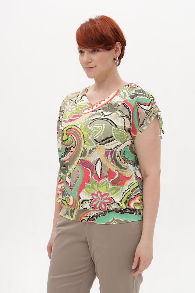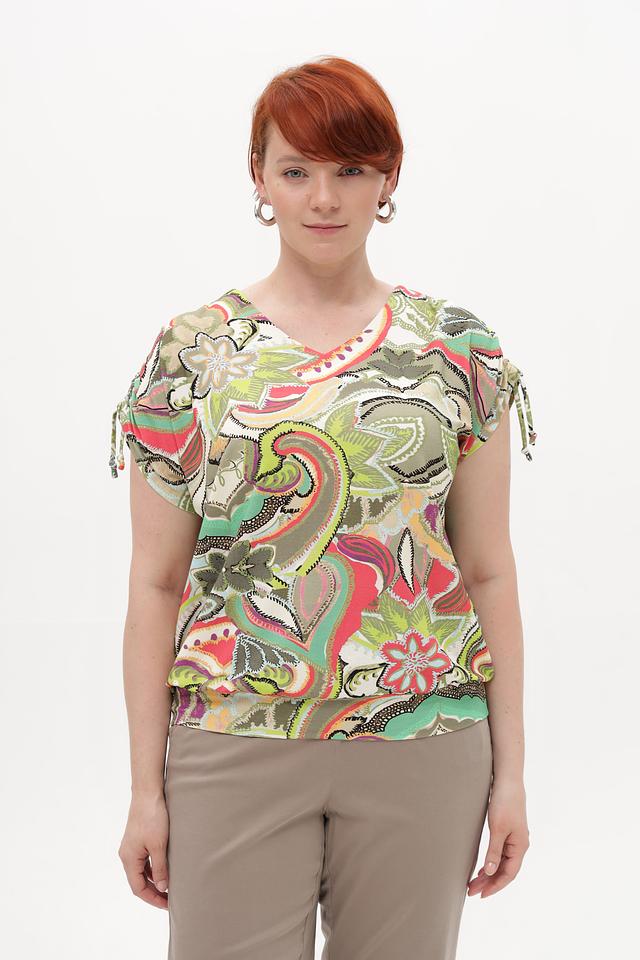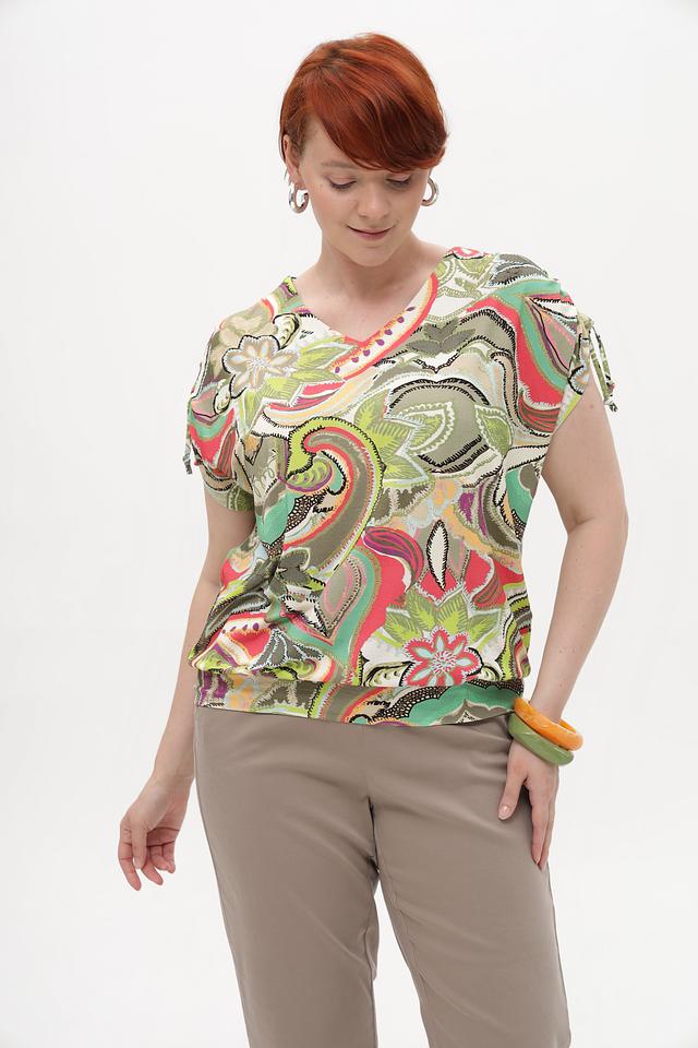 Основной цвет блузы – зеленый, но она украшена ярким и красочным цветочным принтом, включающим в себя оттенки красного, розового, оранжевого и бежевого. Такой рисунок делает эту блузу уникальной и привлекательной.