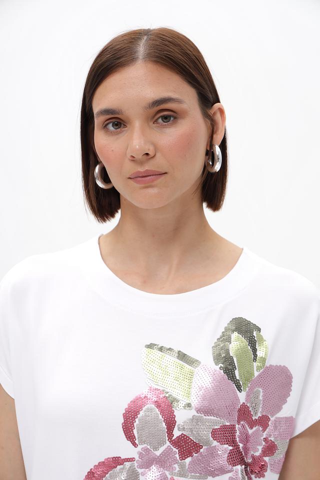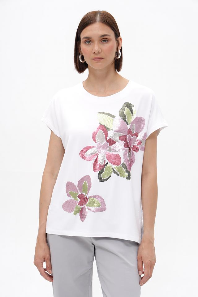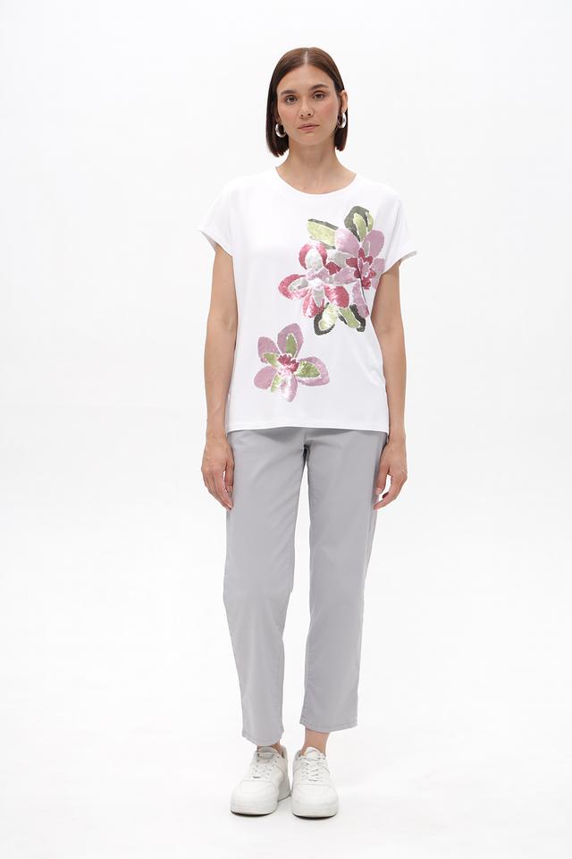 Белая футболка Bianca с цветочной аппликацией — стильная и комфортная модель из вискозы с добавлением эластана. Футболка имеет свободный крой и короткие рукава, идеально подходит для создания повседневных образов. Состав: вискоза 92%, эластан 8%
