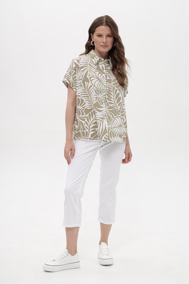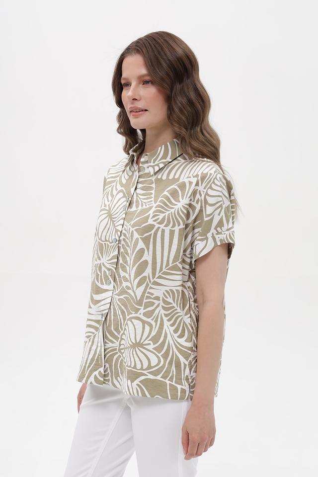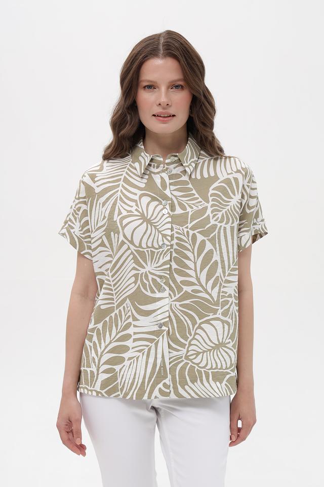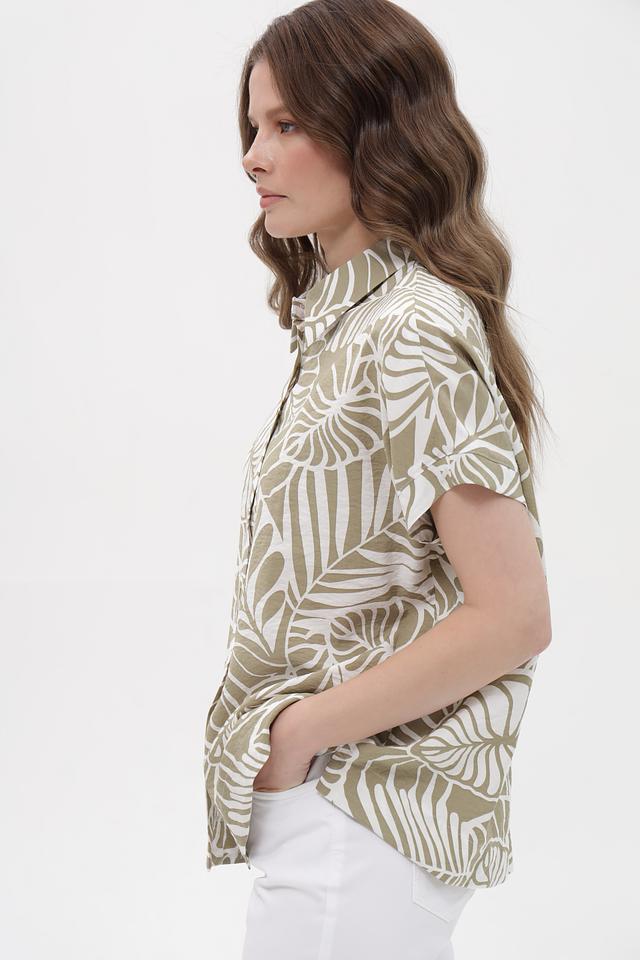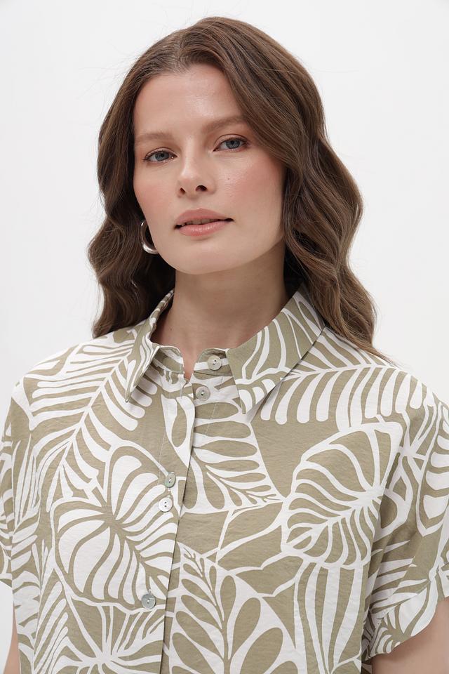 Блуза имеет свободный крой, короткие рукава и классический воротник. Её украшает яркий принт с изображением тропических листьев, выполненный в белых и светло-зелёных тонах на фоне хаки. Застёжка на пуговицы по всей длине позволяет регулировать степень открытости.