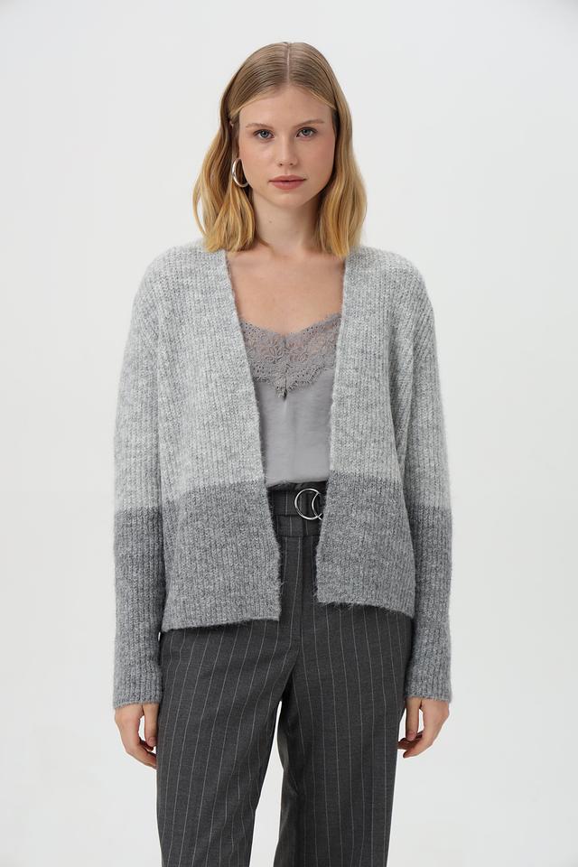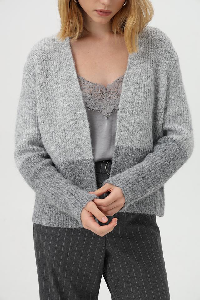 Серый жакет Bianca свободного кроя выполнен из мягкого трикотажа с добавлением шерсти и полиэстера. Отличный вариант для создания уютных образов в прохладную погоду. Состав: полиэстер 74%, полиамид 18%, шерсть 6%, эластан 1%, метализ.нить 1%