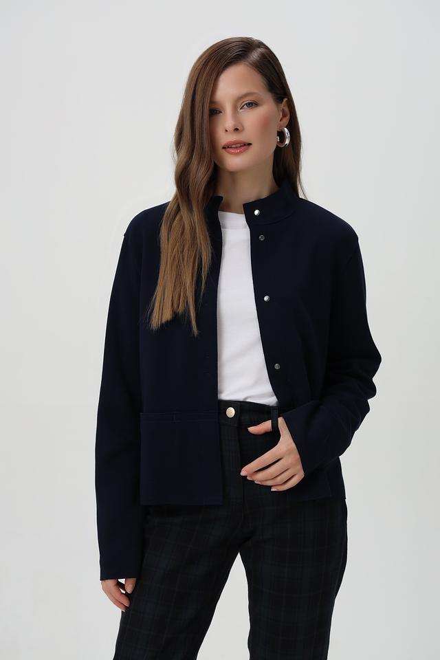 На передней части жакета расположены практичные карманы. Длинные рукавы дополняют образ.
