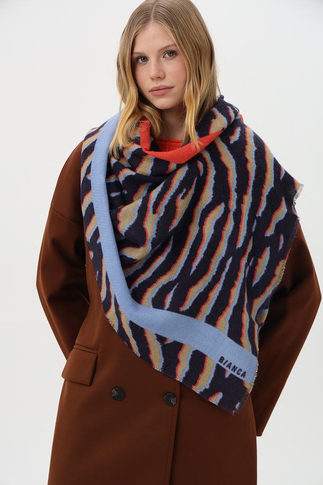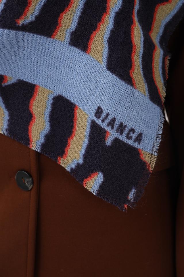 Шарф имеет прямоугольную форму и бахрому по краям, что придает ему дополнительный шарм. Логотип бренда Bianca нанесен на шарф, подчеркивая его аутентичность.