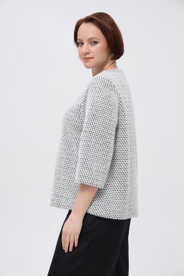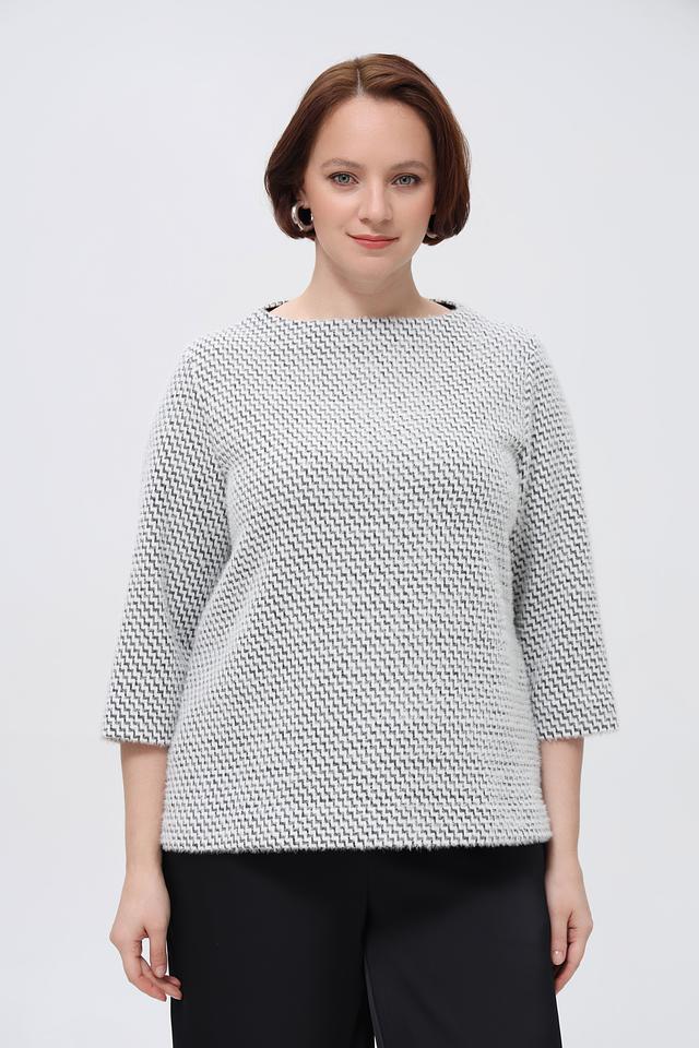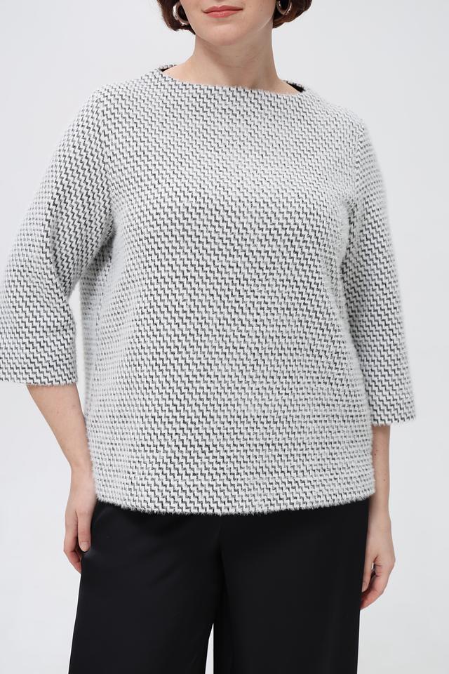 Этот пуловер от Bianca – идеальный выбор для создания элегантного и комфортного образа. Пуловер выполнен в белом цвете с выразительным геометрическим рисунком в чёрную клетку, который придает ему особый шарм.