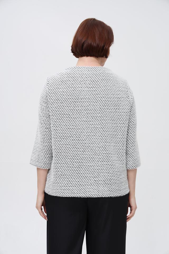 Модель имеет удобный крой с рукавом 3/4 и округлым вырезом горловины. Благодаря сочетанию полиэстера (60%) и полиамида (40%) пуловер обладает приятной текстурой, хорошо держит форму и прост в уходе.