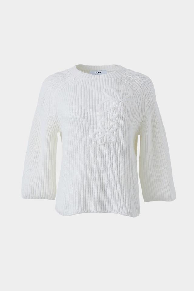 Этот пуловер от Bianca станет прекрасным дополнением к вашему гардеробу. Он выполнен в белом цвете и имеет удобный прямой крой. Модель украшена рельефной цветочной аппликацией на груди, которая придает ей особый шарм и изысканность.