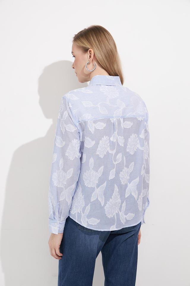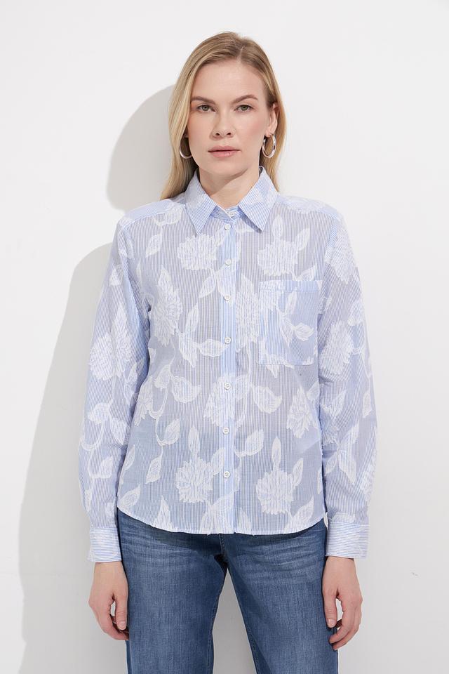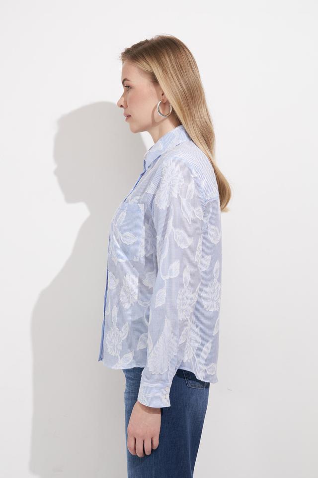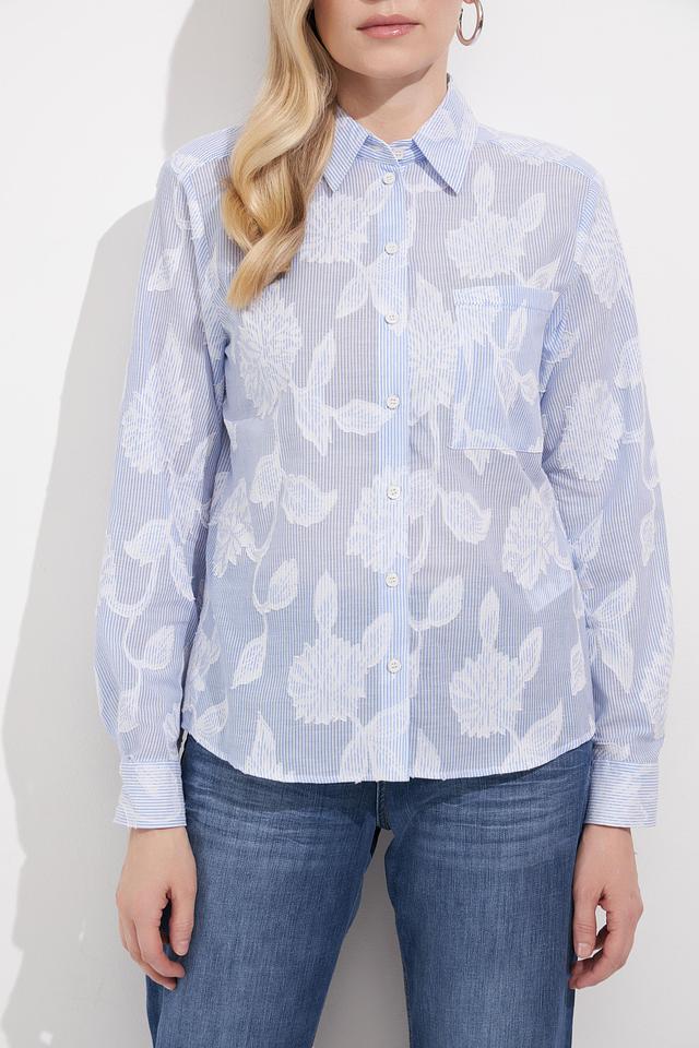 Блуза имеет классический крой с длинными рукавами и воротником-стойкой. Её украшает изысканный цветочный принт на фоне голубой полоски, который придаёт ей романтичное настроение.