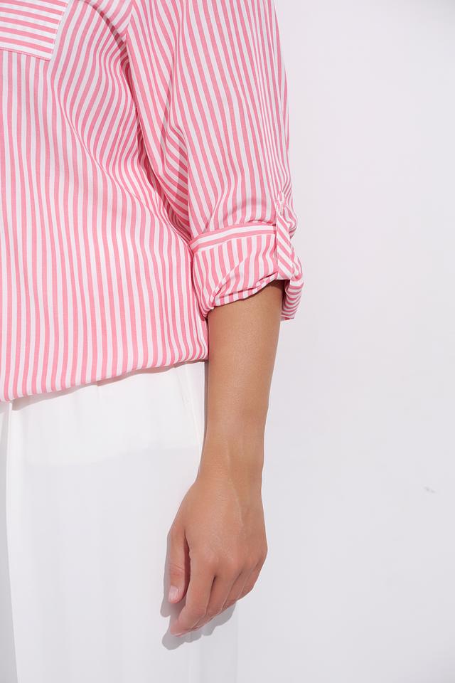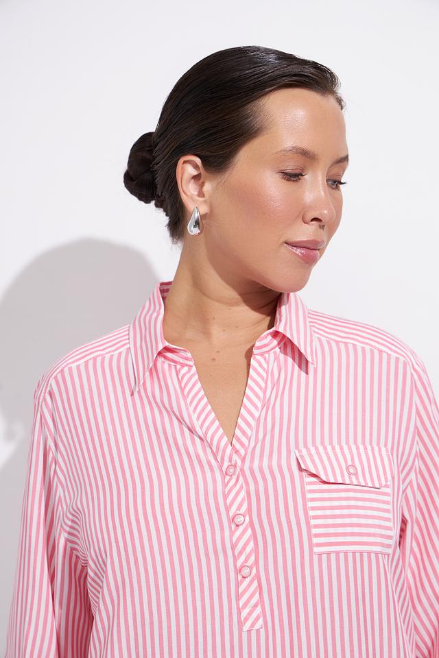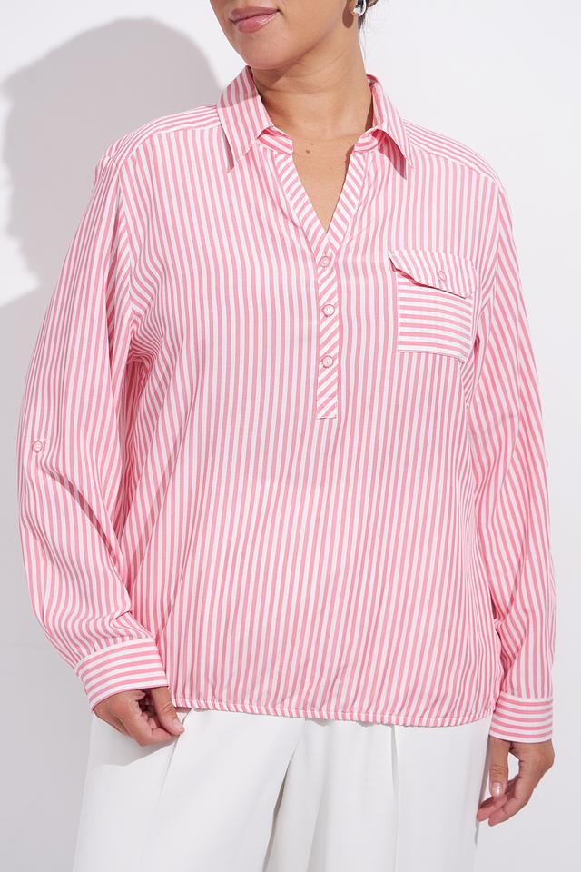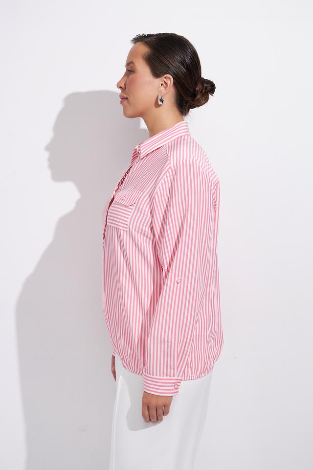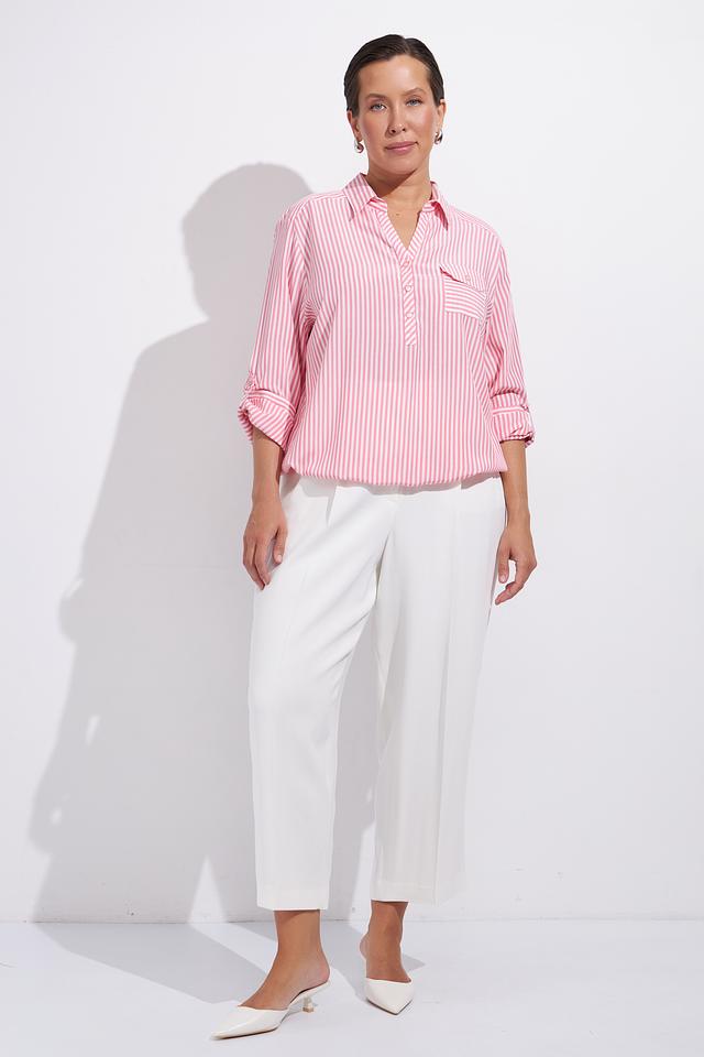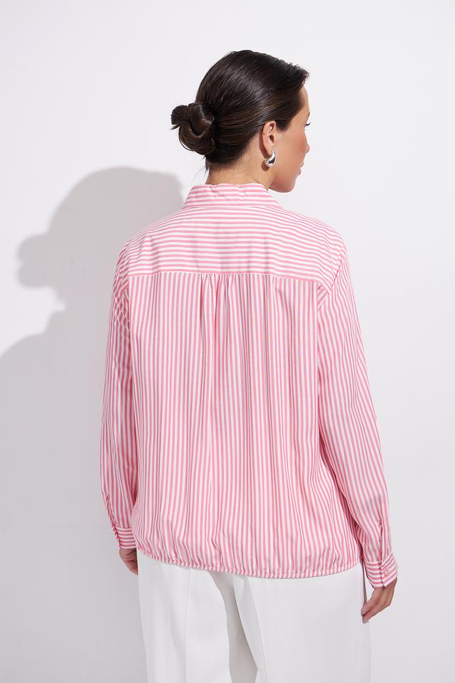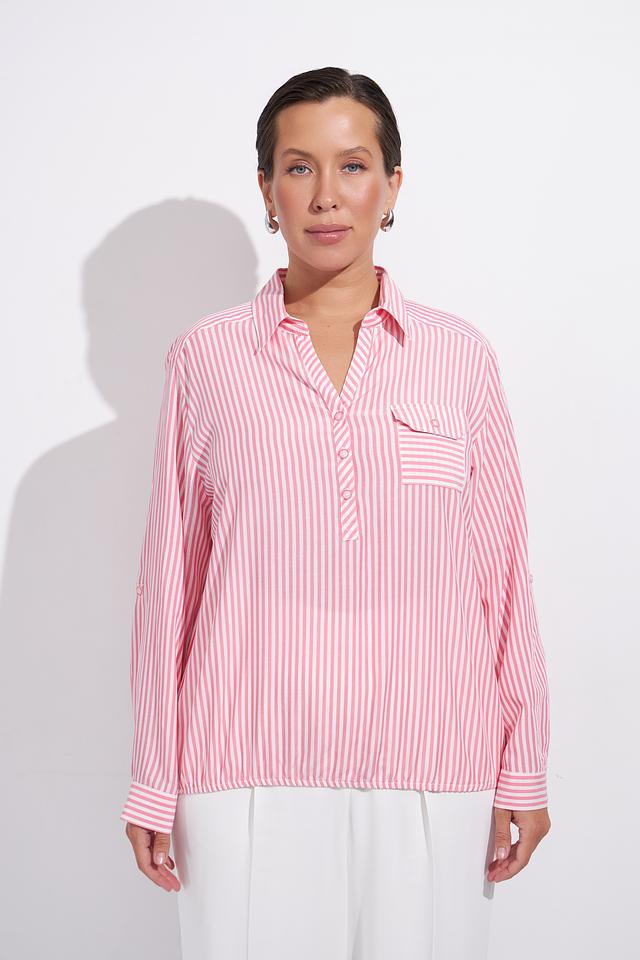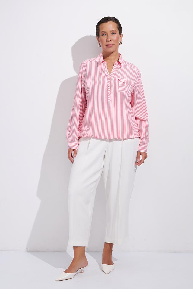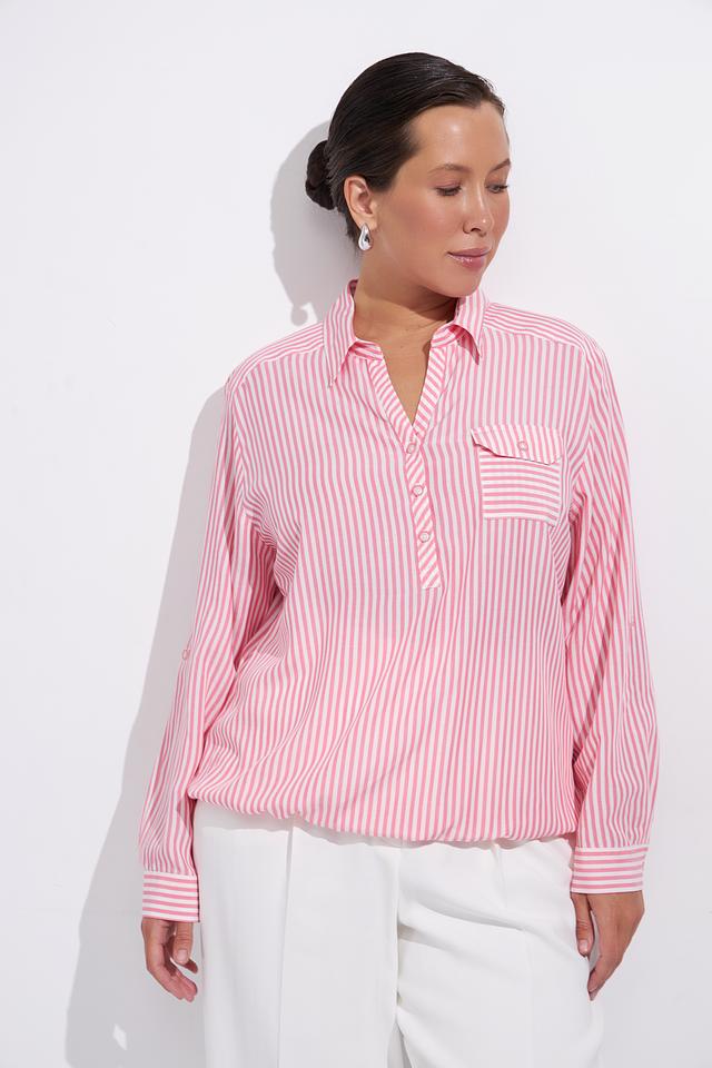 Нежно-розовый цвет в сочетании с белой полоской делает эту блузу универсальной и подходящей для различных случаев. Она легко сочетается с брюками, юбками и джинсами, позволяя создавать разнообразные образы.