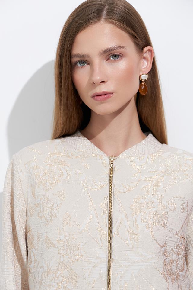 Состав ткани: 79% полиэстер, 17% металлизированная нить, 4% эластан. Такой состав обеспечивает лёгкость, прочность и устойчивость к сминанию. Жакет легко стирается и быстро сохнет.