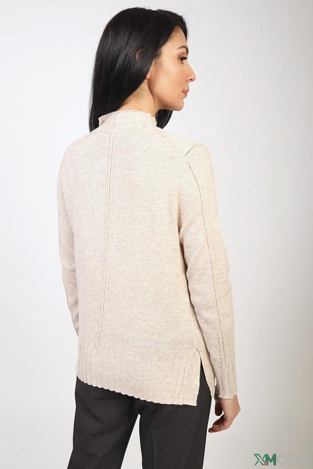 Низ пуловера и рукава оформлены рифленой вязкой. Сбоку изделия выполнен небольшой разрез. Этот пуловер идеально сочетается с брюками, юбками и джинсами, создавая стильные и комфортные образы.