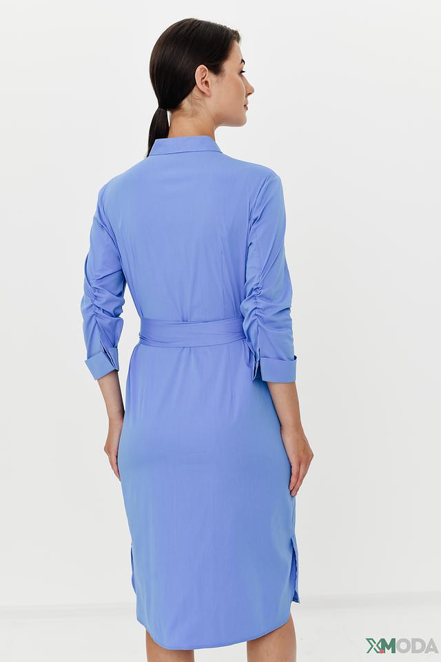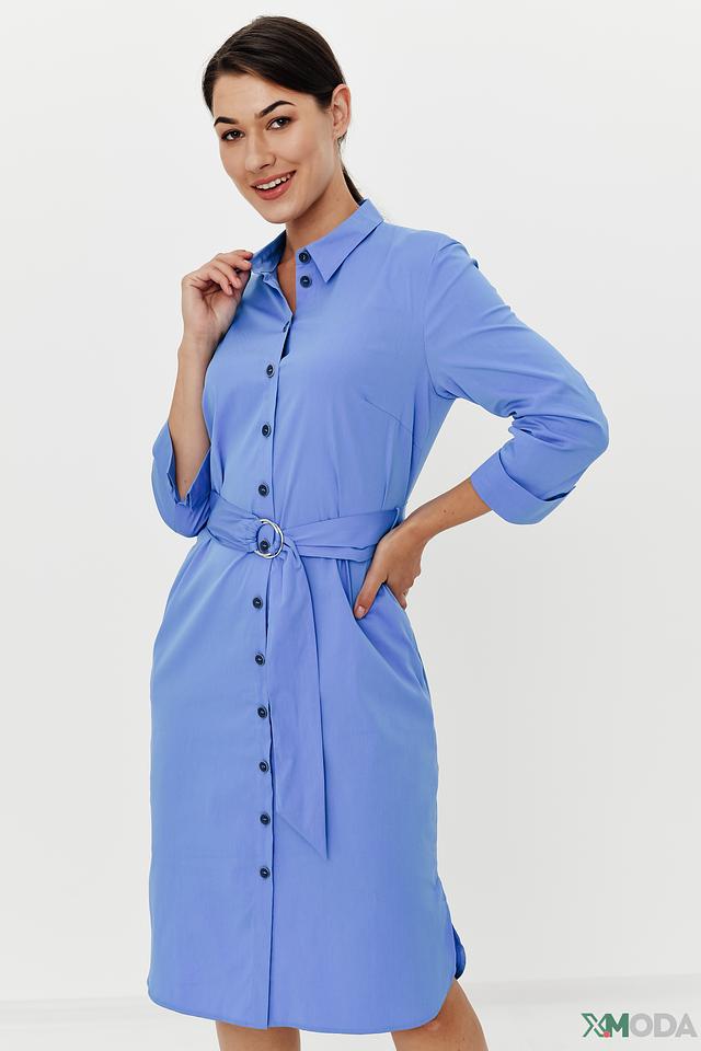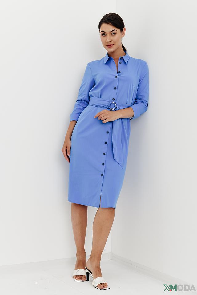 Модель имеет прямой крой, воротник, застежку на пуговицы по всей длине и длинные рукава с манжетами. Талия подчеркнута притачным поясом, который можно завязать на бант или узел. Платье выполнено из качественного материала, состоящего из 75% хлопка, 22% полиамида и 3% эластана, что обеспечивает комфорт в носке и хорошую посадку по фигуре.