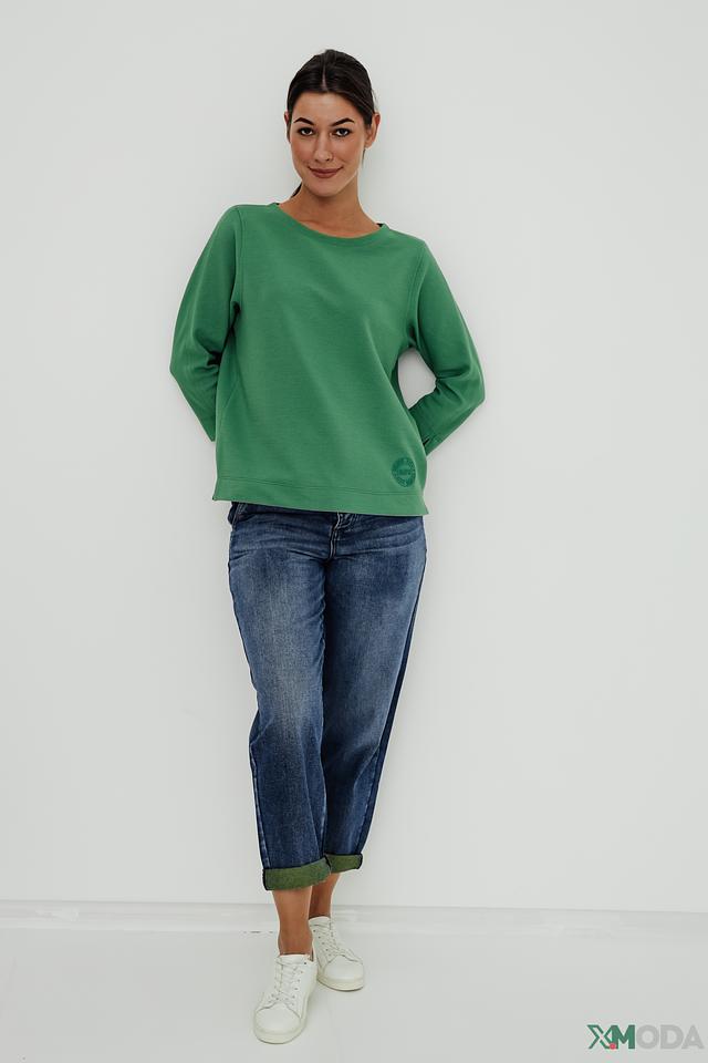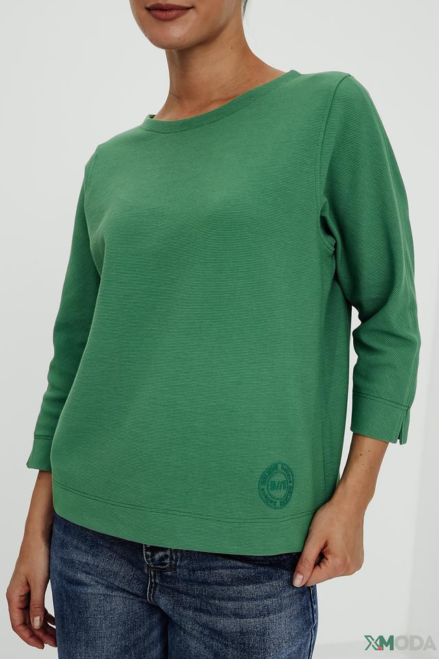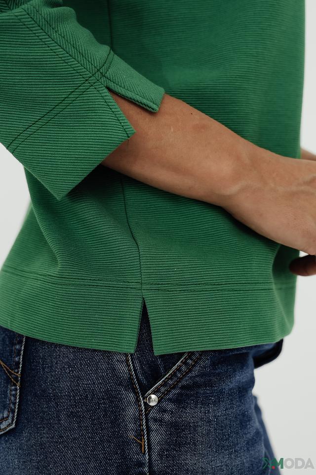 Модель имеет круглый вырез горловины и рукава 3/4 с небольшими разрезами по бокам, что придает ей оригинальность. Пуловер изготовлен из высококачественного хлопка с добавлением полиэстера и эластана, что обеспечивает комфорт при носке и сохранение формы.
