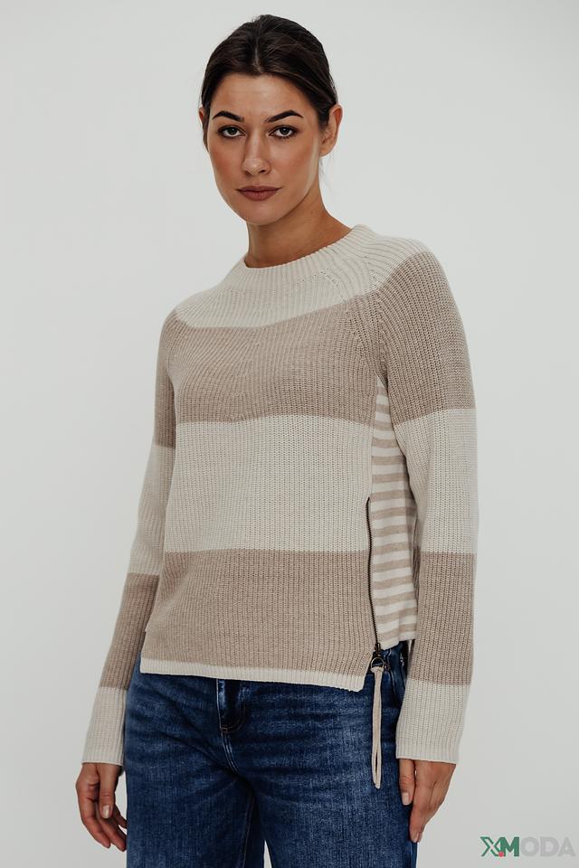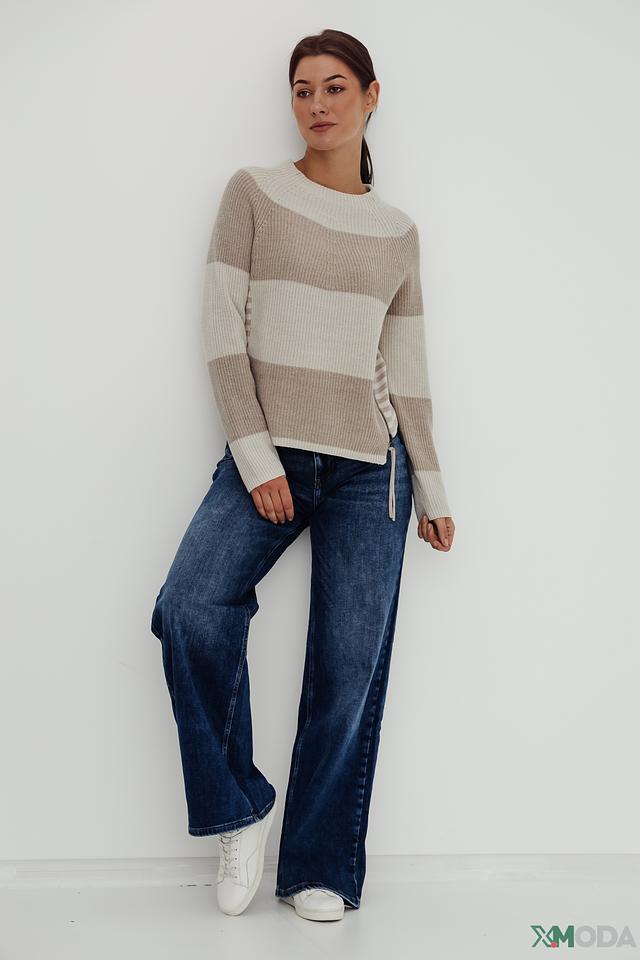Этот пуловер от Bianca выполнен в спокойной бежевой гамме с добавлением светлых и тёмных оттенков, создающих эффект полоски. Модель имеет классический крой с длинными рукавами и круглым вырезом горловины.
