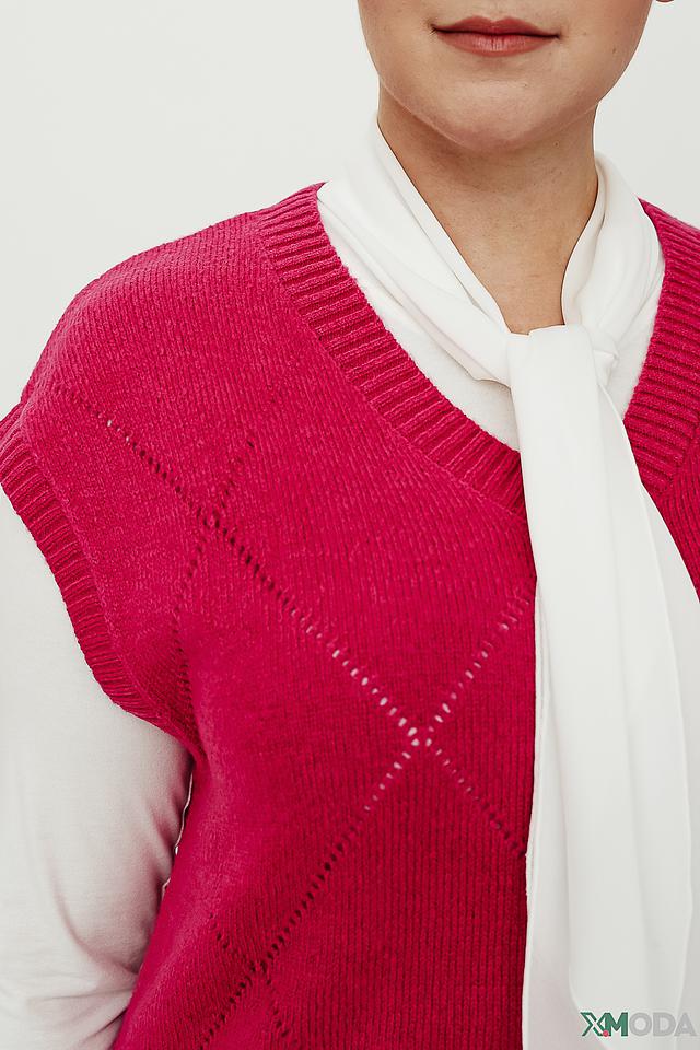 Модель имеет классический крой без рукавов и V-образный вырез, что делает ее универсальной и подходящей для различных стилей одежды. Особый шарм жилету придает ромбовидный узор, выполненный в технике вязания.