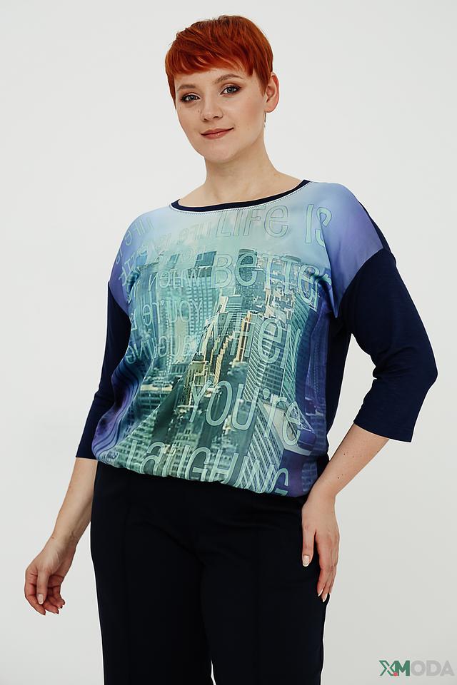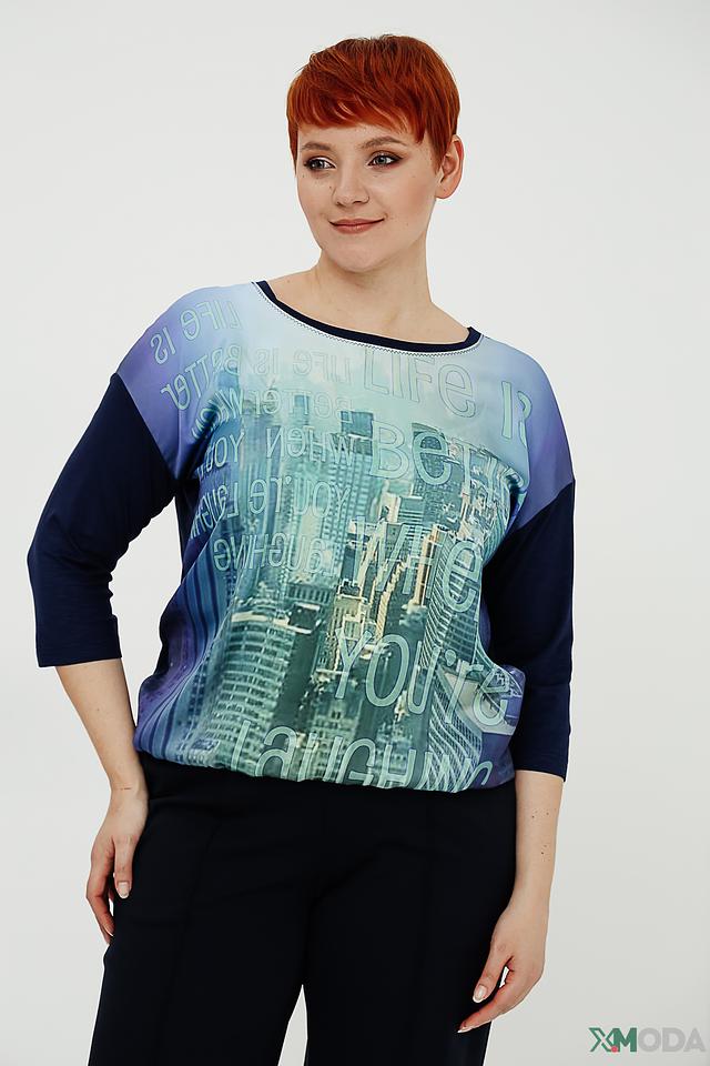Блуза Bianca синего цвета с ярким принтом в виде городского пейзажа. Модель выполнена из мягкой вискозы с добавлением эластана, что обеспечивает комфорт и удобство в носке. Блуза с рукавом 3/4 станет отличным дополнением к вашему гардеробу. Состав: вискоза 95%, эластан 5%