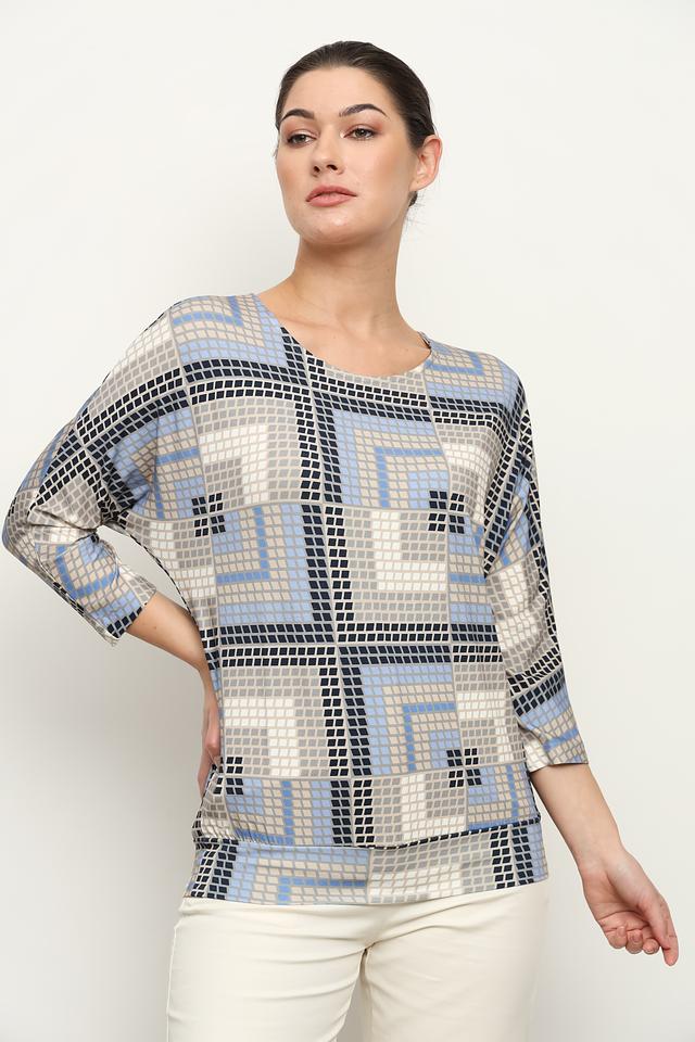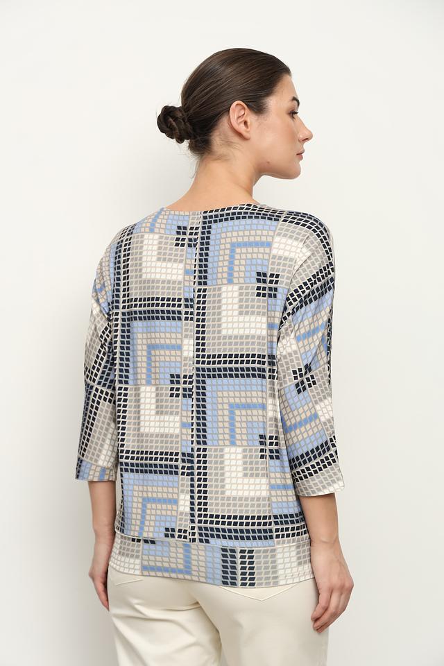 Блуза имеет округлый вырез горловины и рукава длиной 3/4, что делает ее универсальной для любого времени года. Особенностью модели является яркий геометрический принт, выполненный в голубых, серых и белых тонах. Принт придает блузе оригинальность и неповторимый стиль.
